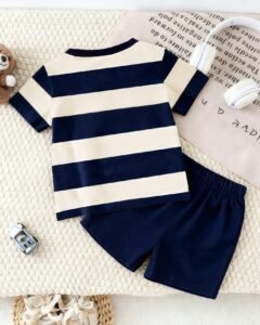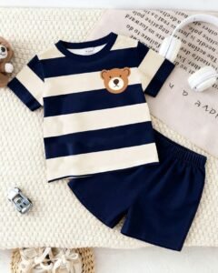 Camiseta de manga corta con estampado de oso y rayas + pantalones cortos azul marino