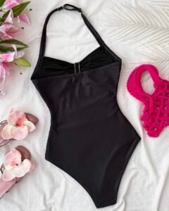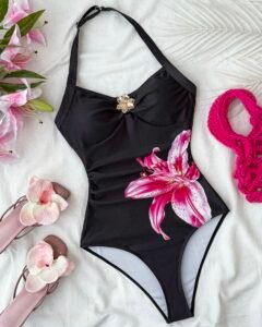 Traje de baño de una pieza con estampado floral y decoración metálica