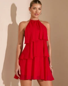 Vestido corto de gasa rojo sólido con hojas de loto en cascada