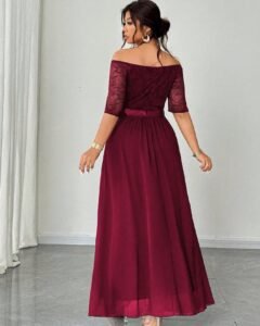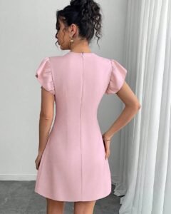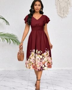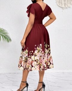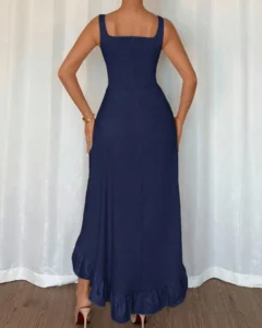 Vestido de mujer con cuello cuadrado, volantes en el bajo y bajo-alto