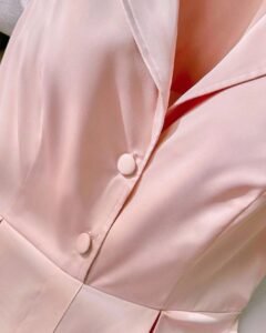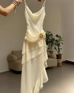 Vestido largo de satén con cuello drapeado, detalle de volantes