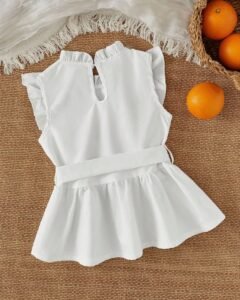 Blusa con cuello mao, bordado floral blanco y dobladillo con volantes