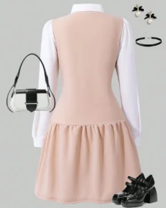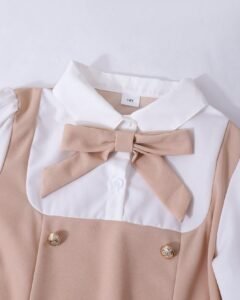Vestido casual con cuello de lazo, botones de metal y bloqueo de color