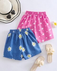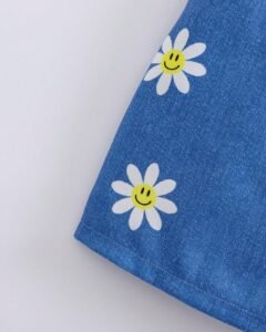 short asimétricos con estampado de girasol, corazón y cara sonriente con efecto de mezclilla