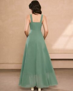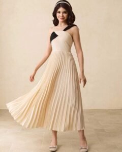 Vestido elegante de fiesta con tirantes finos, plisado, parche y cintura fruncida
