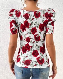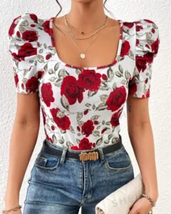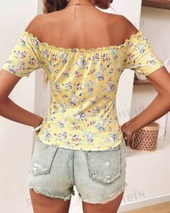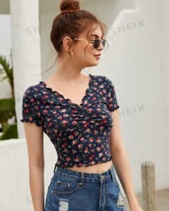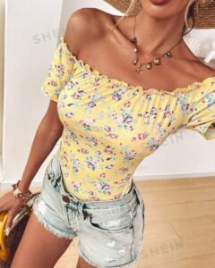 Camiseta corta ribete en forma de lechuga con estampado de lunares con estamapdo floral