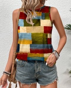 Camiseta de tirantes de cuello redondo para verano con bloqueo de color casual