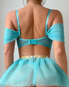 Conjunto de lencería de mujer con vestido de malla con adorno floral y tanga