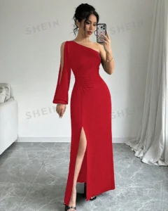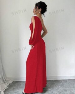 Vestido largo de manga larga con cuello asimétrico