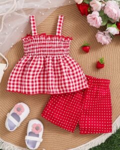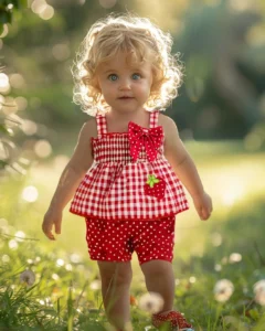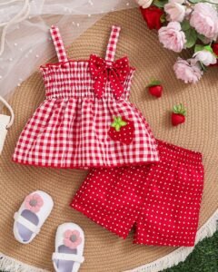 Blusa con bordado de fresa y pantalones cortos con lunares