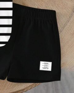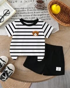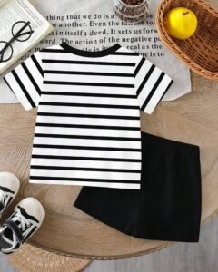 camiseta de manga corta con estampado a rayas de osito y pantalones cortos negros