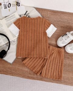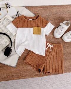 bebé niño con parte superior acanalada de color azul y blanco a juego con pantalones azules
