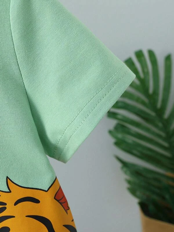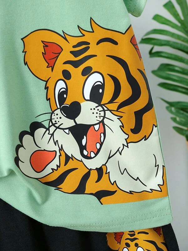 2 piezas/set de camiseta de manga corta con estampado de cabeza de tigre de dibujos animados de ajuste holgado informal diario y pantalones cortos para ni?os peque?os, suave y c?modo, verano