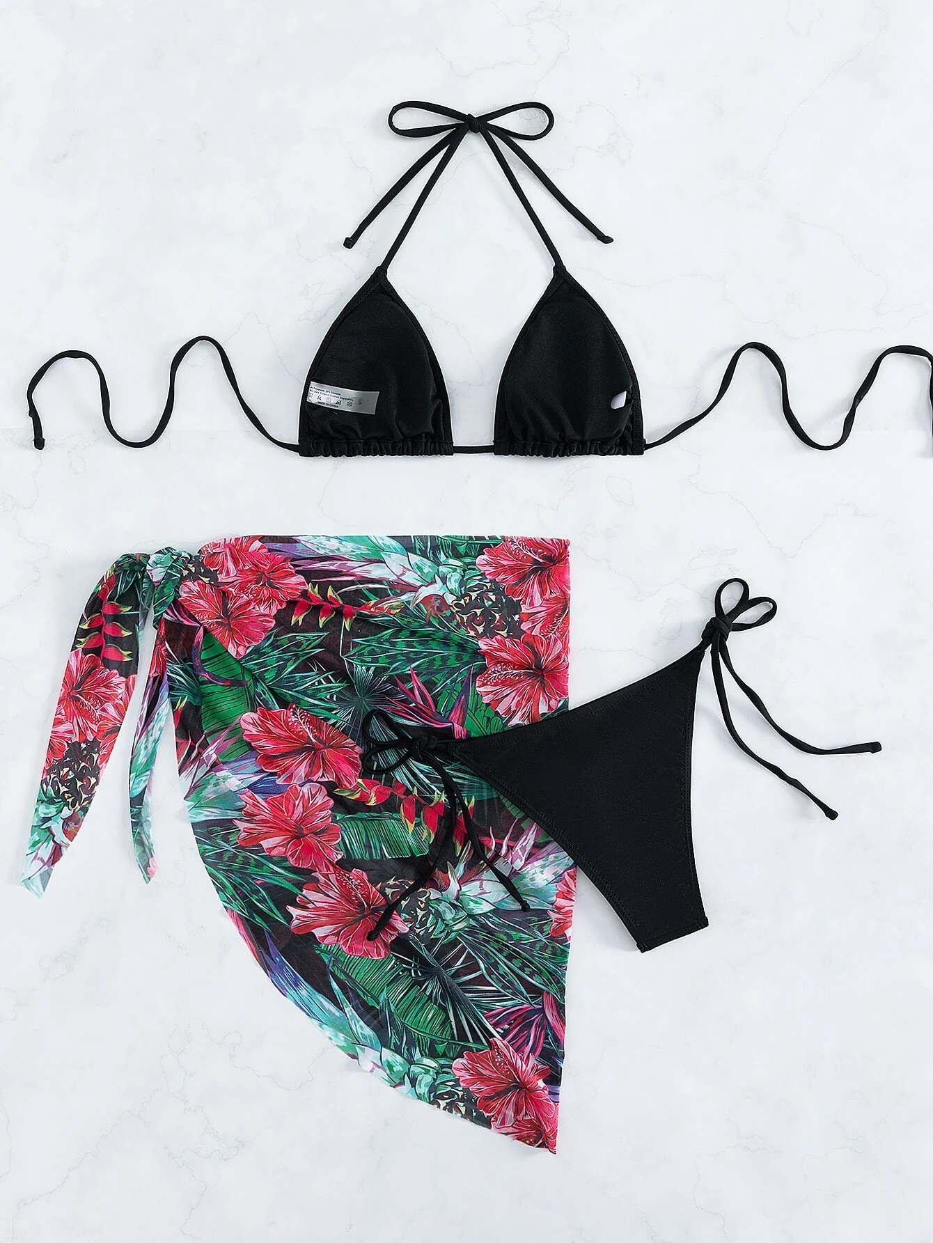 3 piezas Ba?ador bikini tri?ngulo con estampado tropical & falda de playa