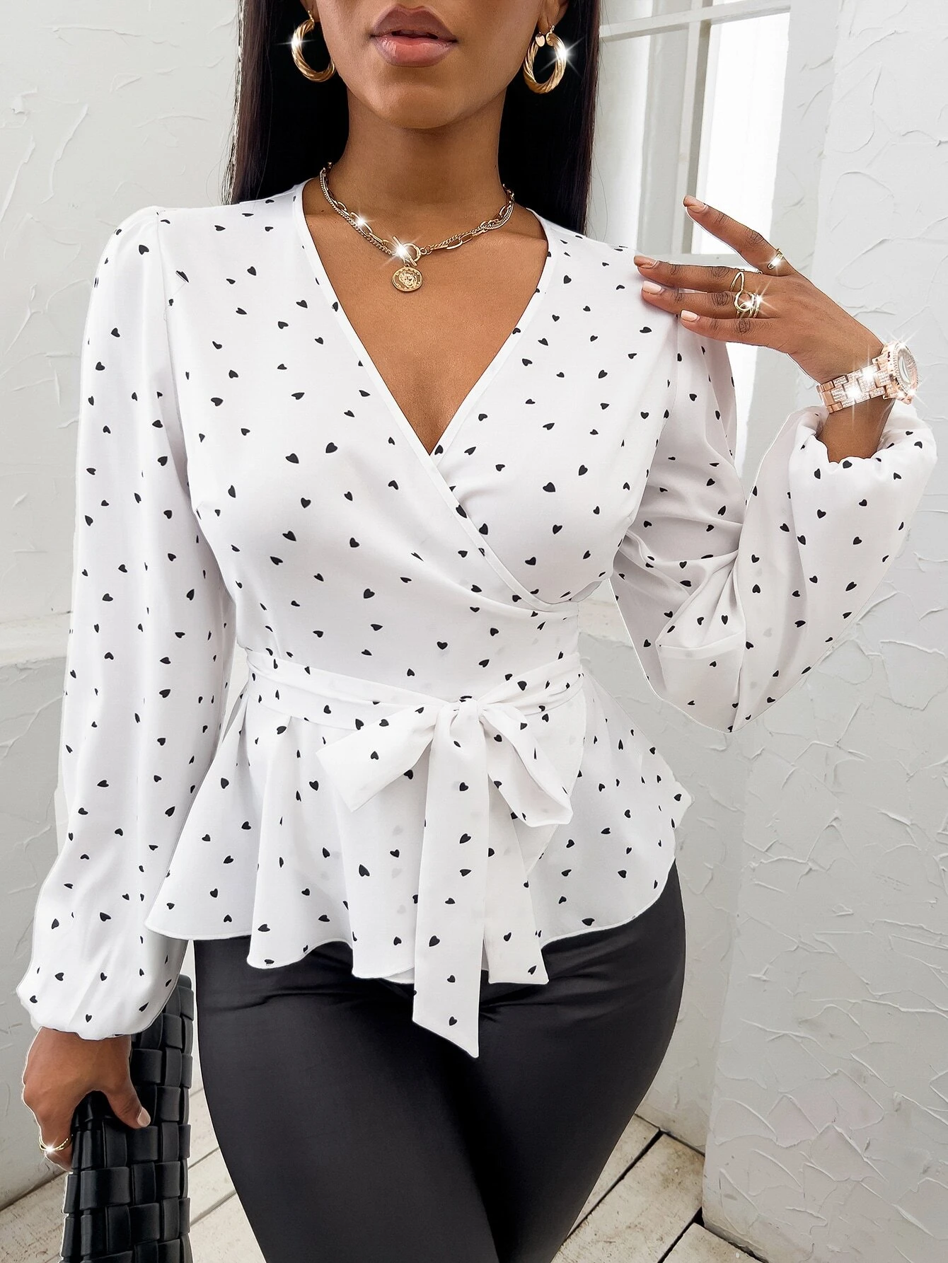 Blusa al azar con estampado de coraz?n de cuello cruzado con cintur?n