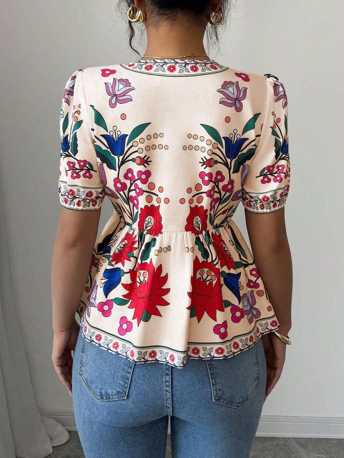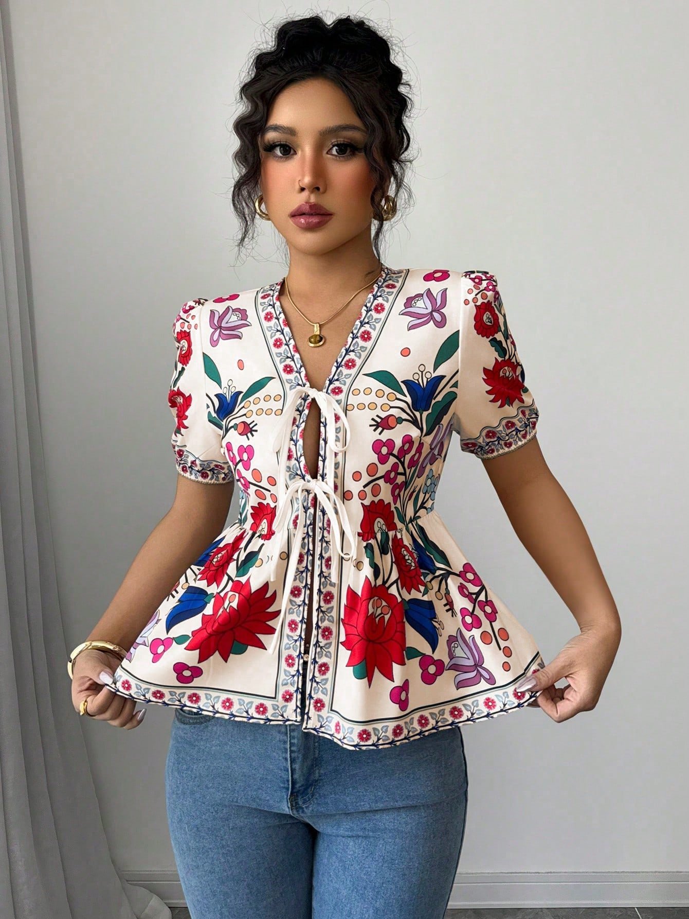 Blusa casual de mujer con estampado floral, mangas abullonadas y nudo delantero