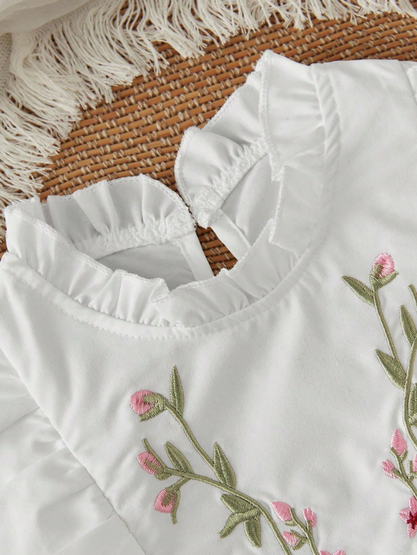 Blusa con cuello mao, bordado floral blanco y dobladillo con volantes