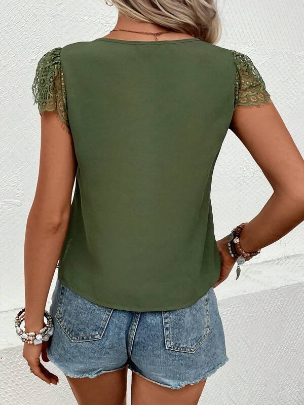 Blusa con encaje en contraste de cuello con cord?n ribete en abanico