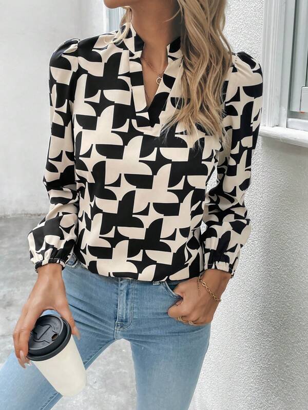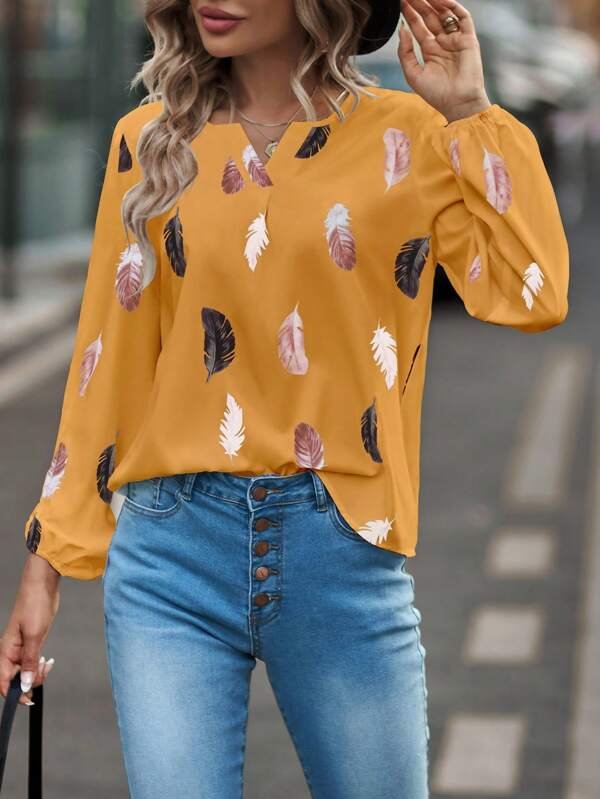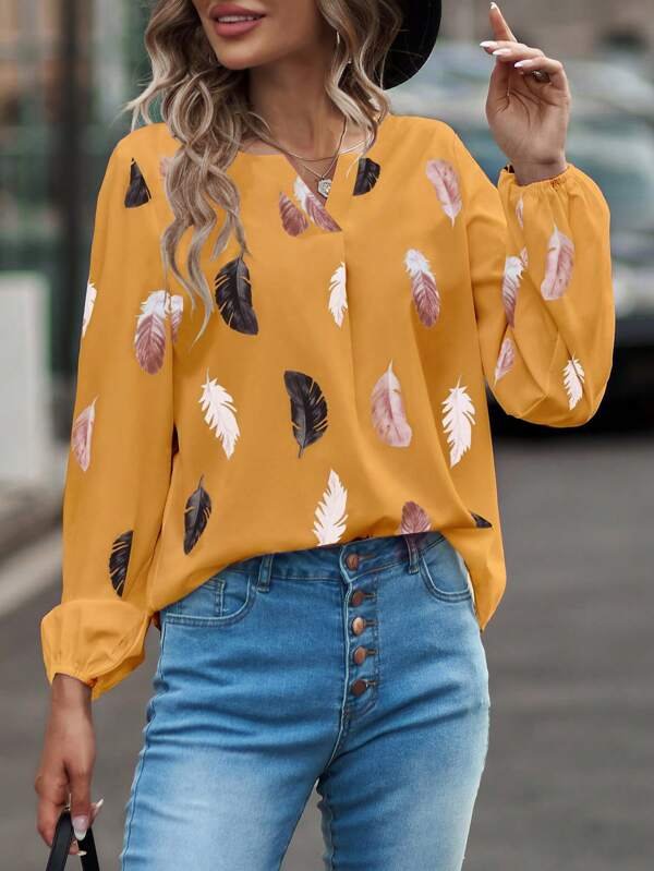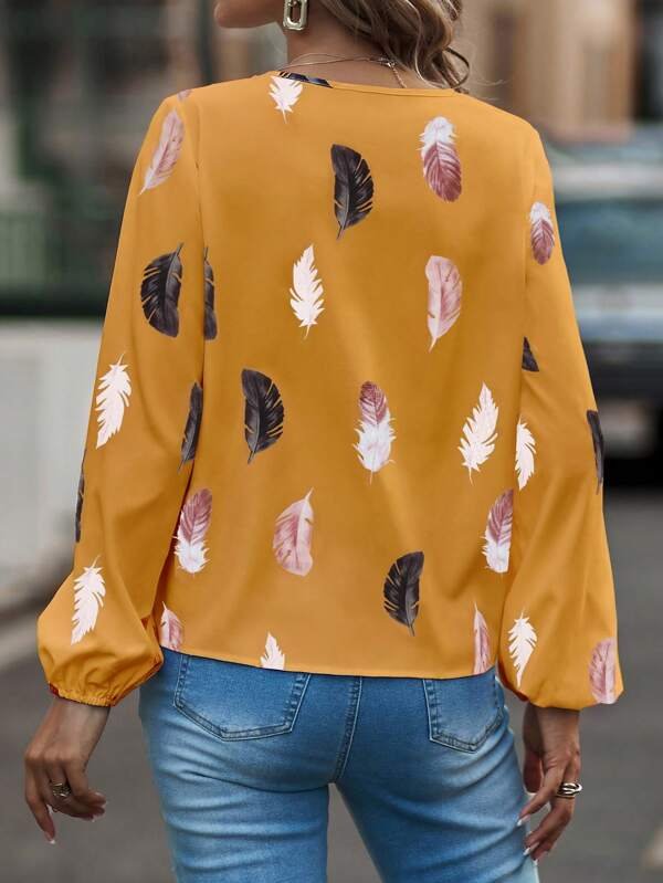 Blusa con estampado de pluma de manga farol de cuello notch