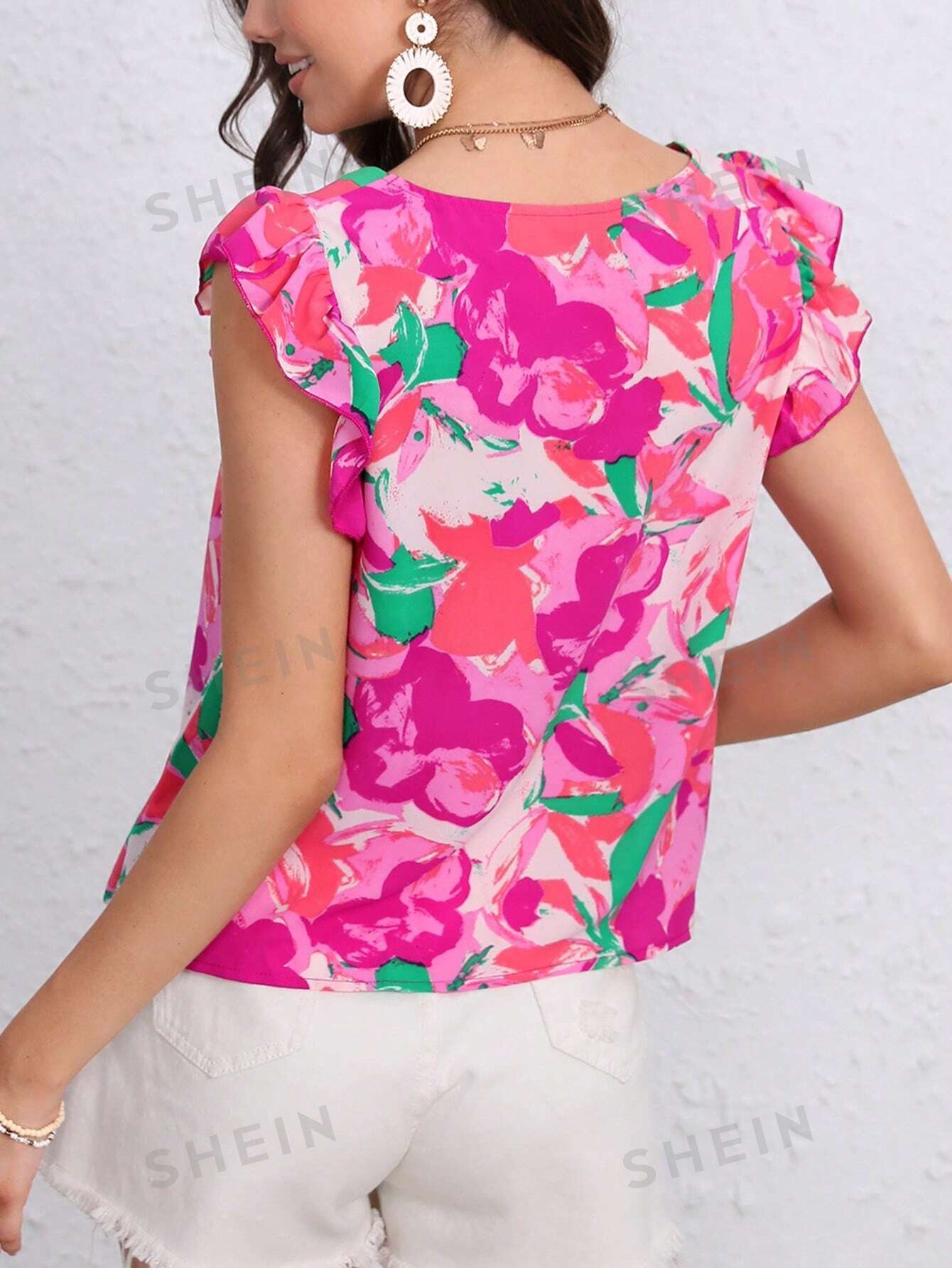 Blusa con estampado floral de cuello cuadrado ribete con fruncido