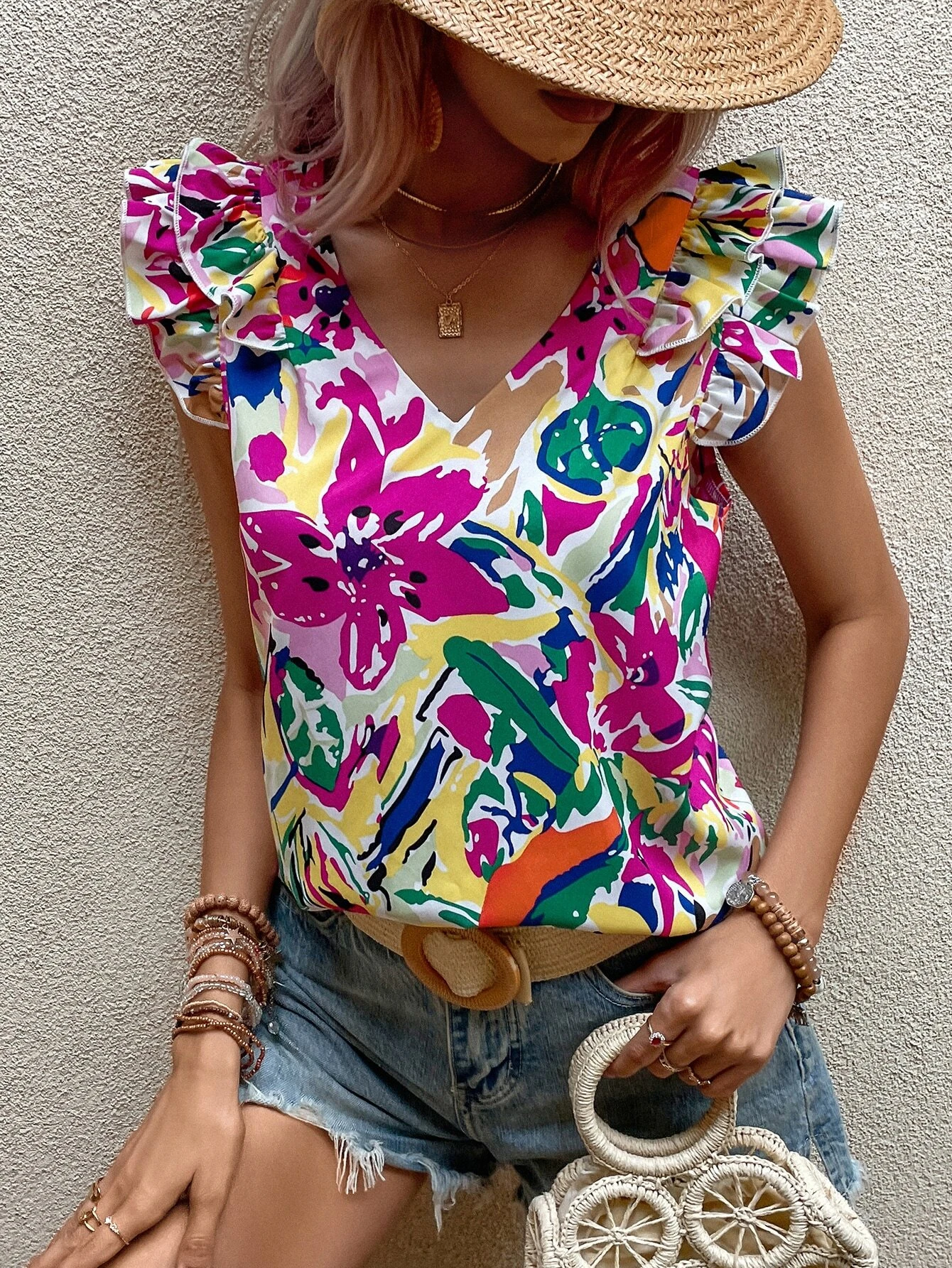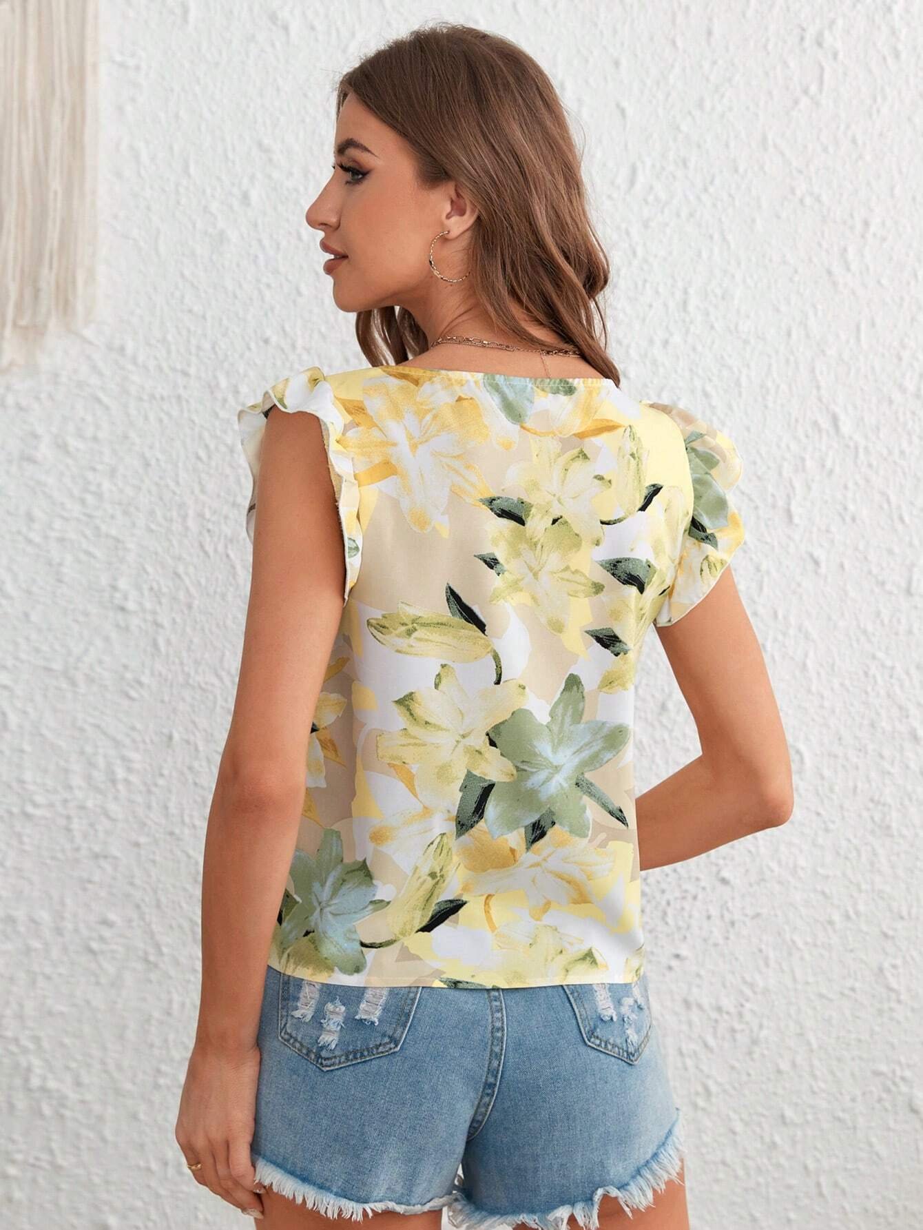 Blusa con estampado floral ribete con fruncido de cuello cuadrado