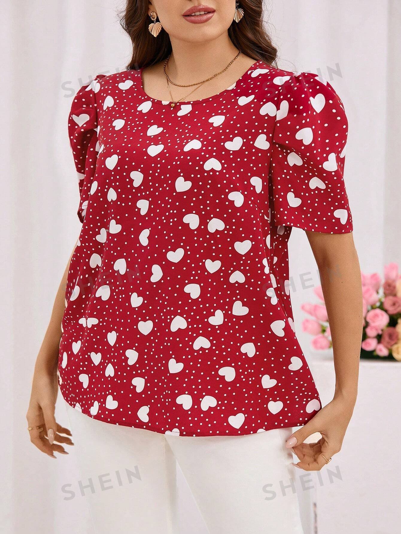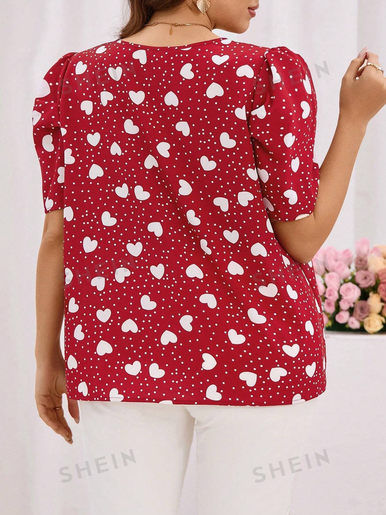Blusa Con Mangas Abullonadas Con Dise?o De Corazones Y Lunares En Tallas Grandes