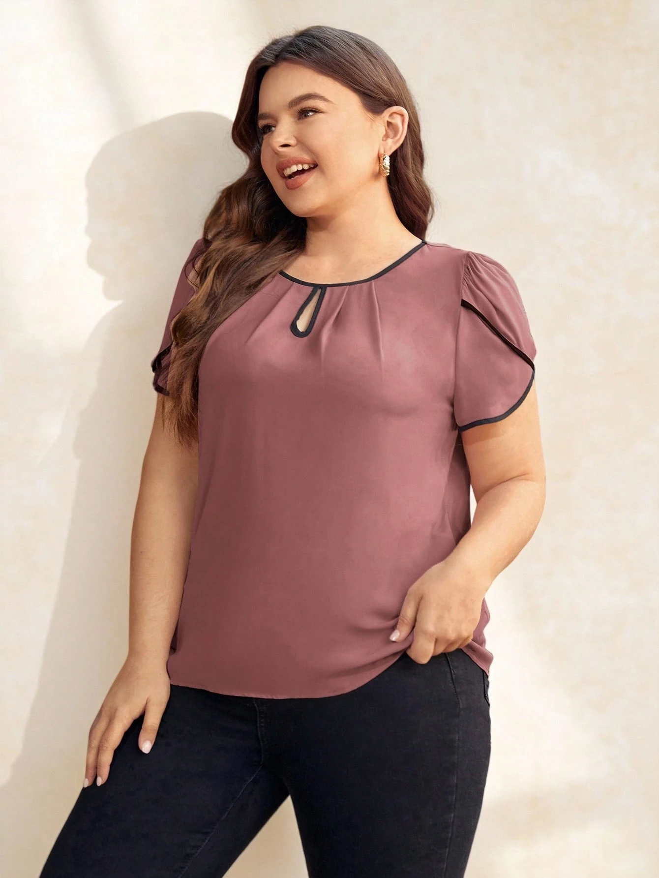 Blusa de cuello con abertura de ojo manga tulipán unido en contraste