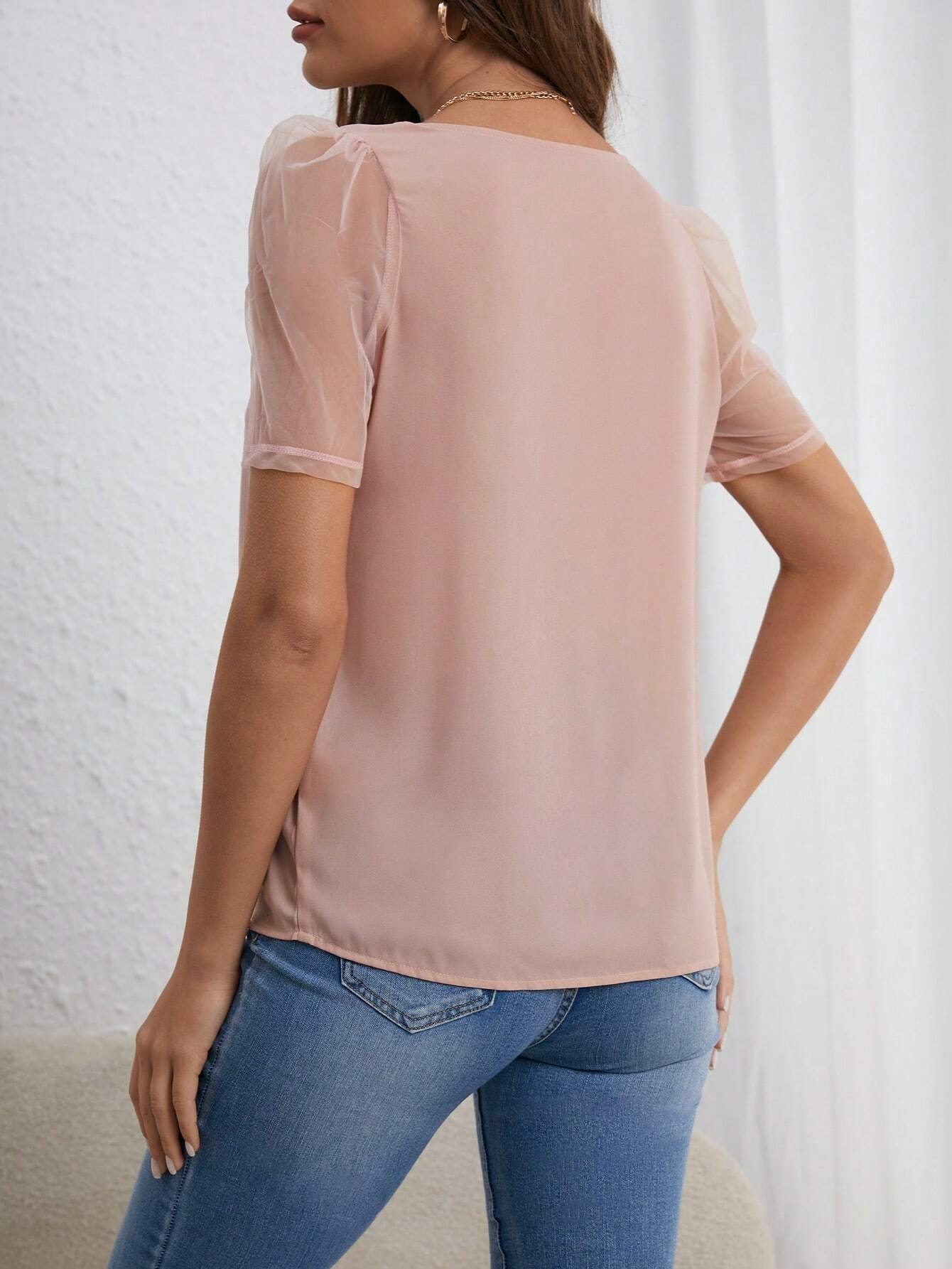 Blusa de malla en contraste de manga farol de cuello asim?trico