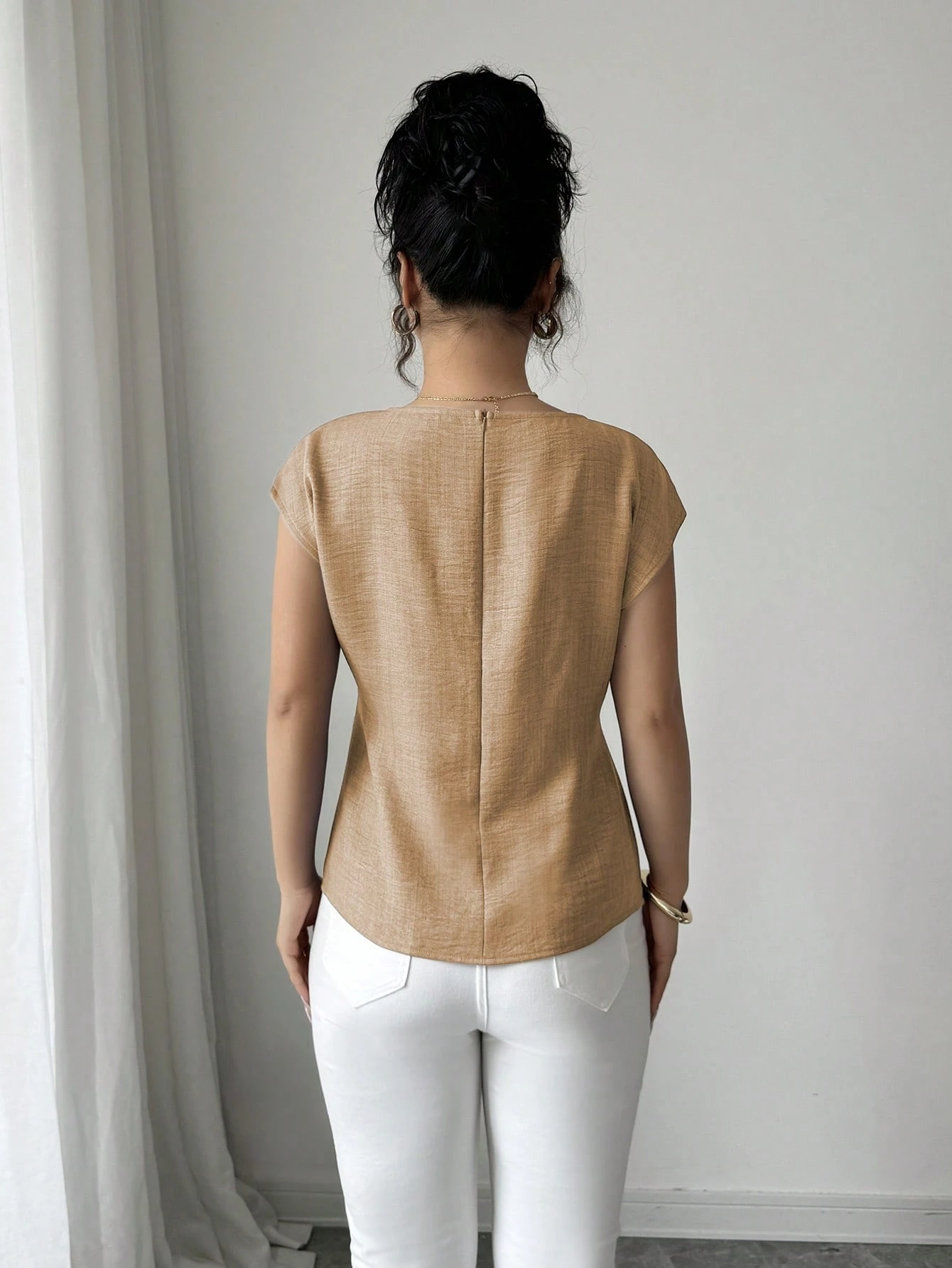 Blusa de mujer de verano de diseño asimétrico con cuello redondo