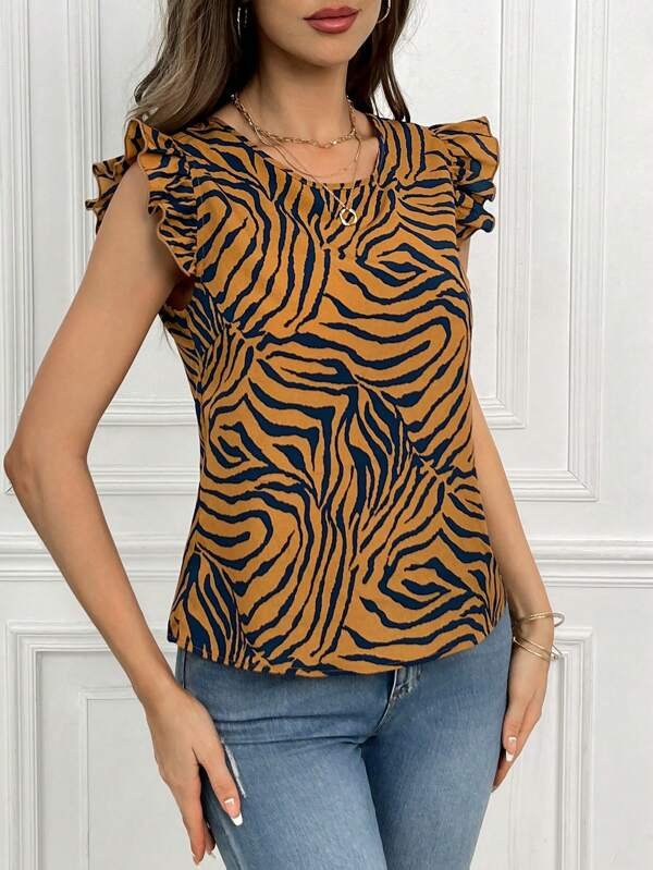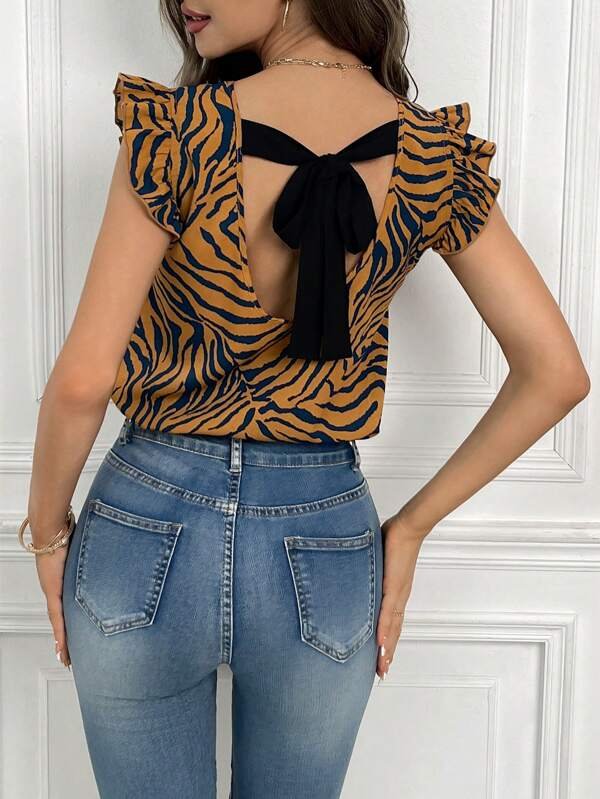 Blusa de rayas de cebra de espalda abierta con cord?n ribete con fruncido