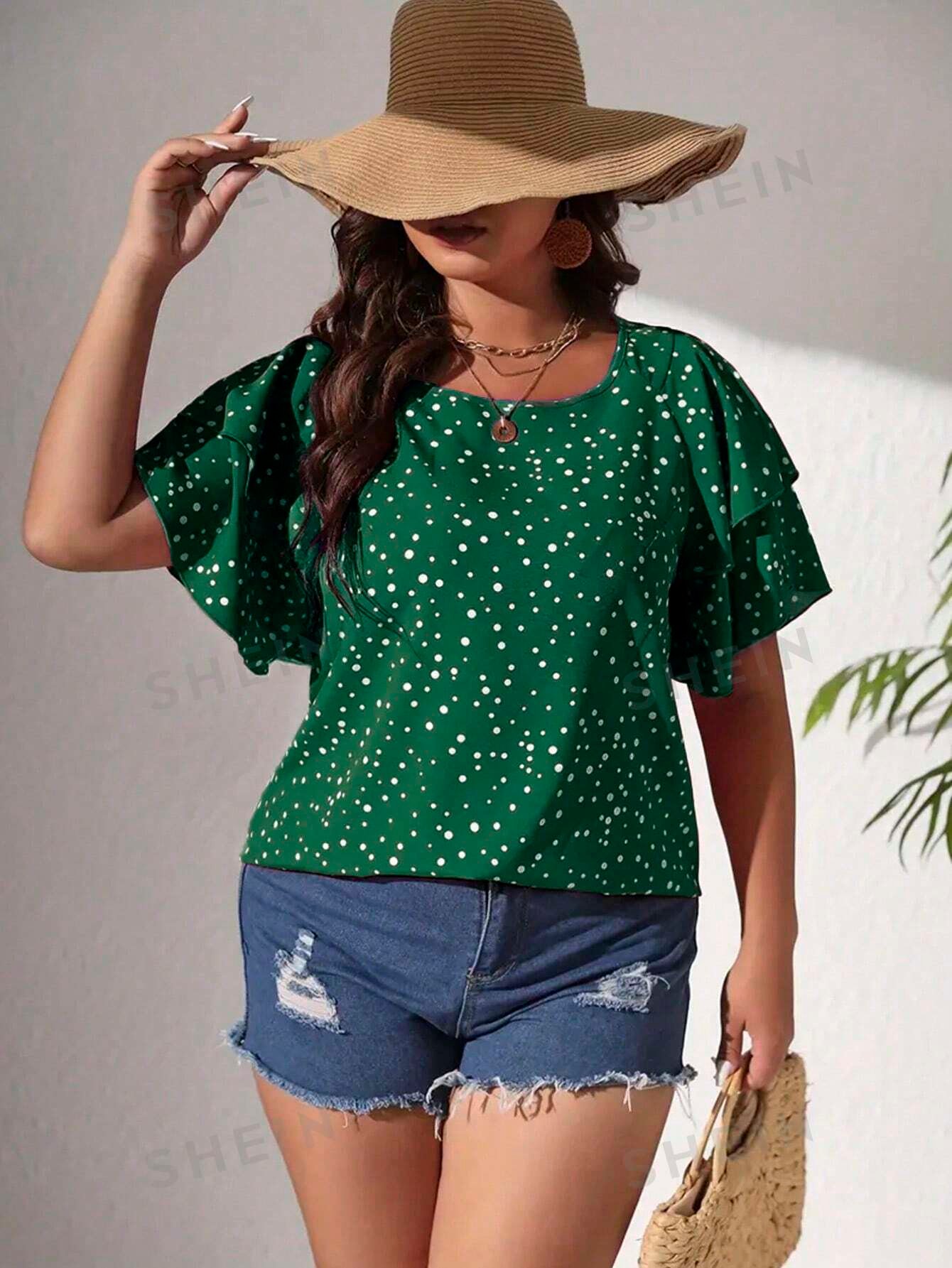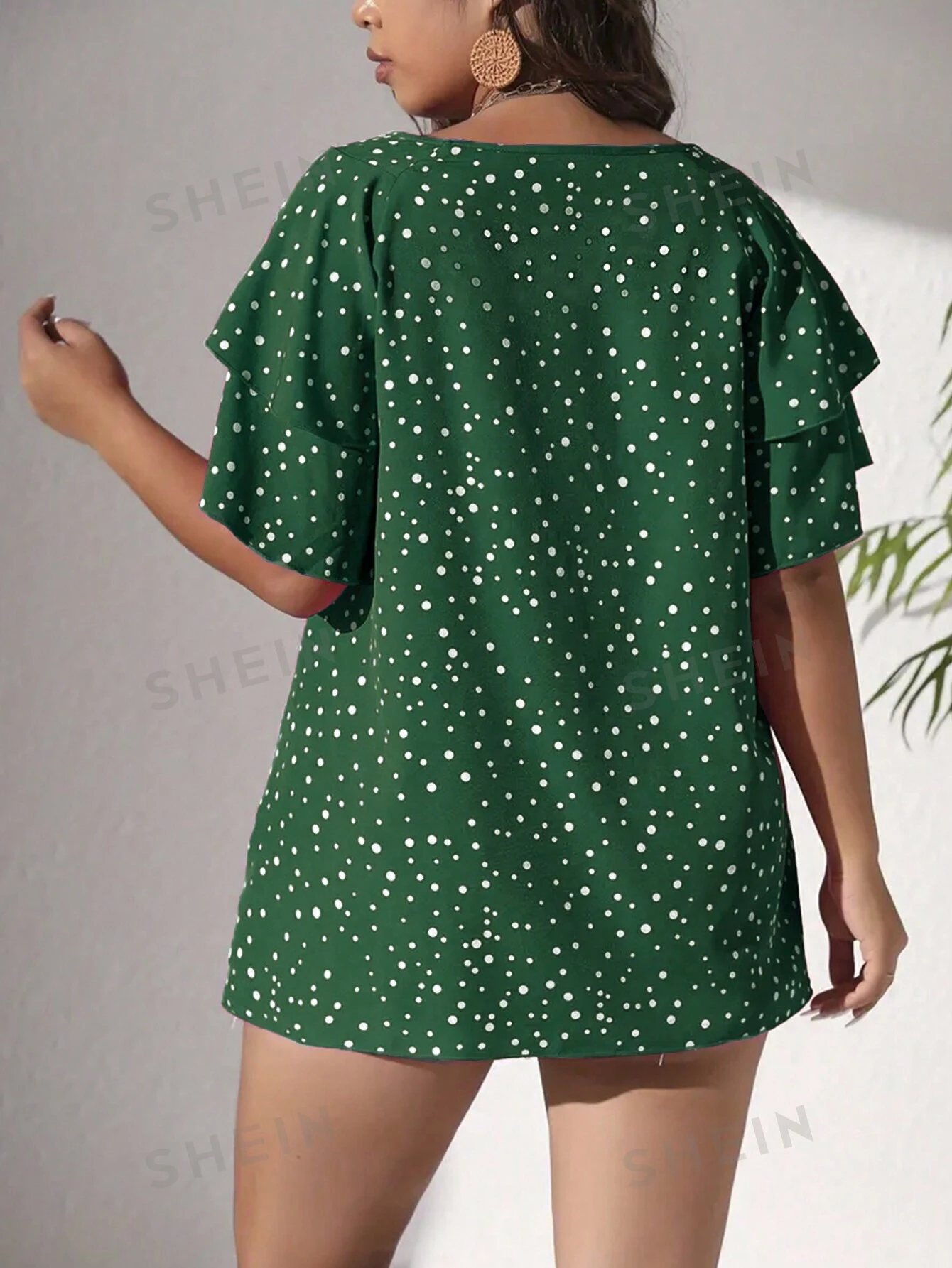 Blusa de talla grande con estampado de lunares y volantes en el borde