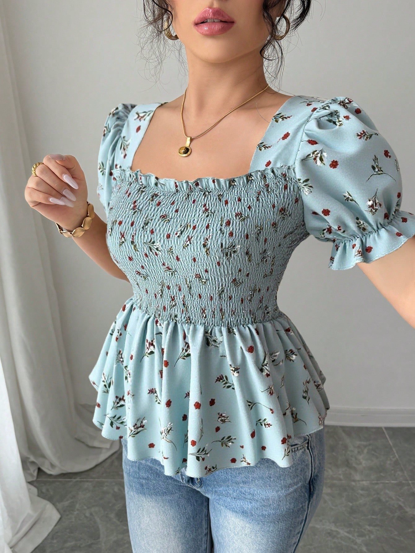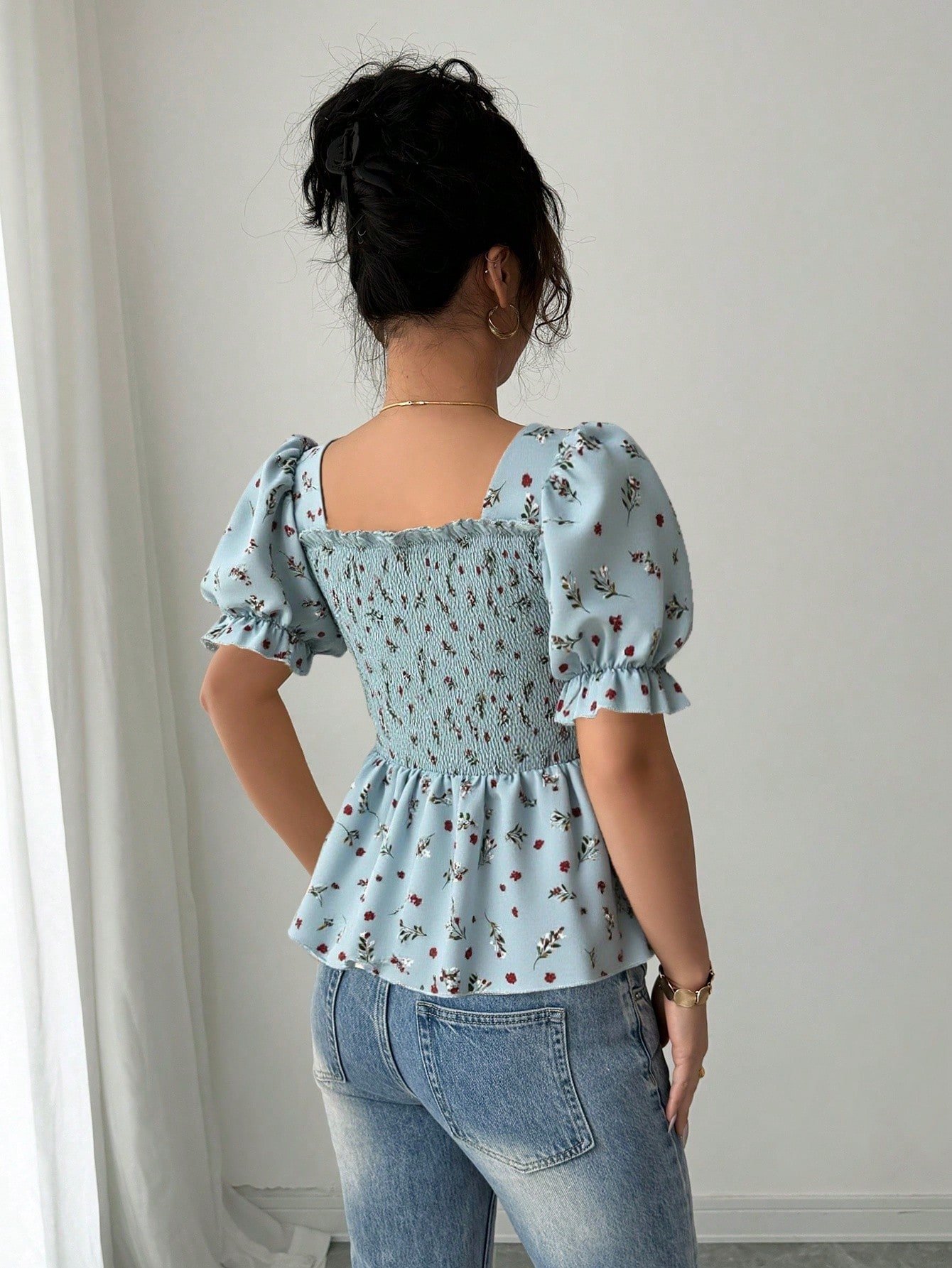 Blusa elegante de ajuste slim con botones y estampado floral minimalista