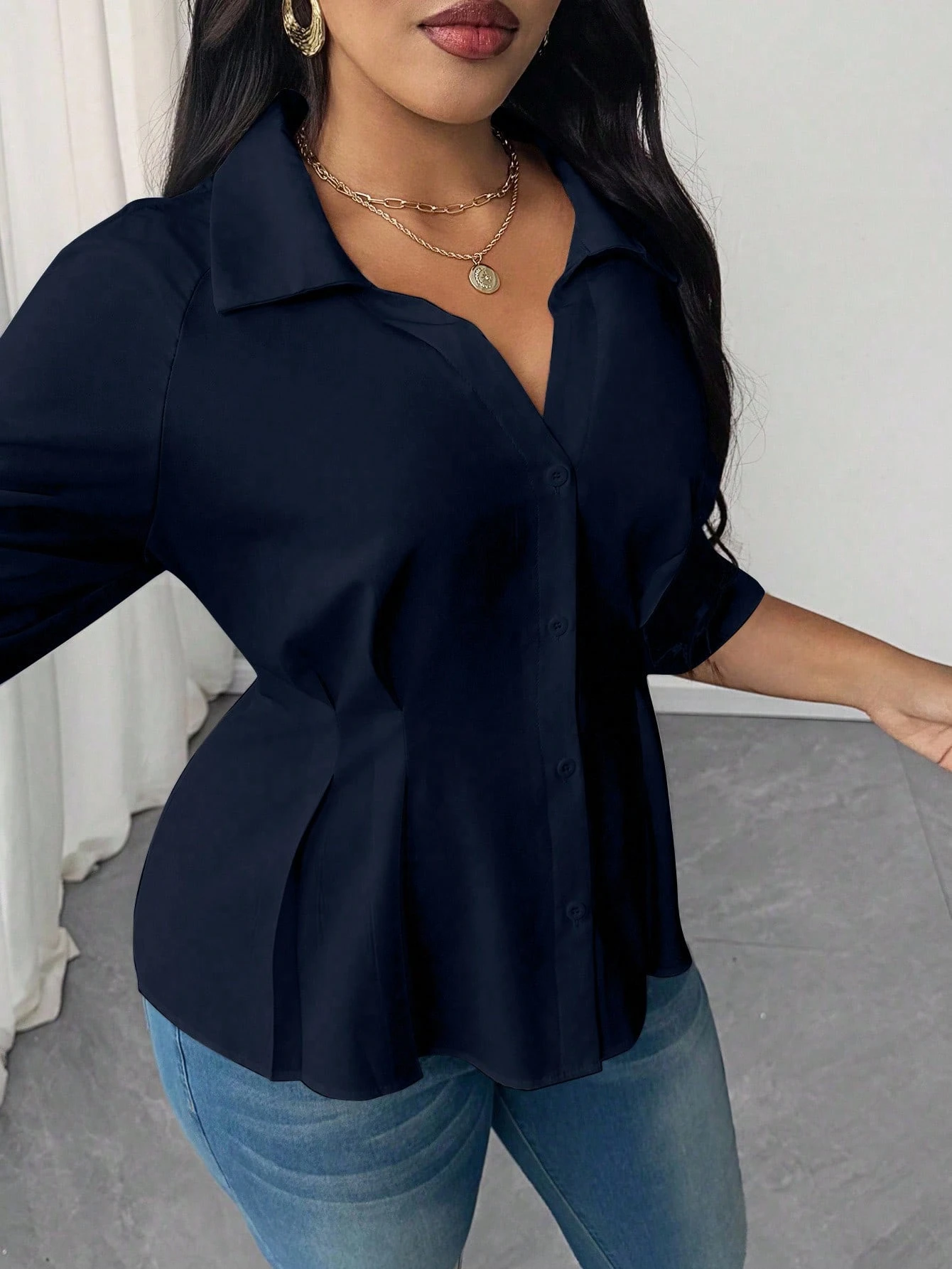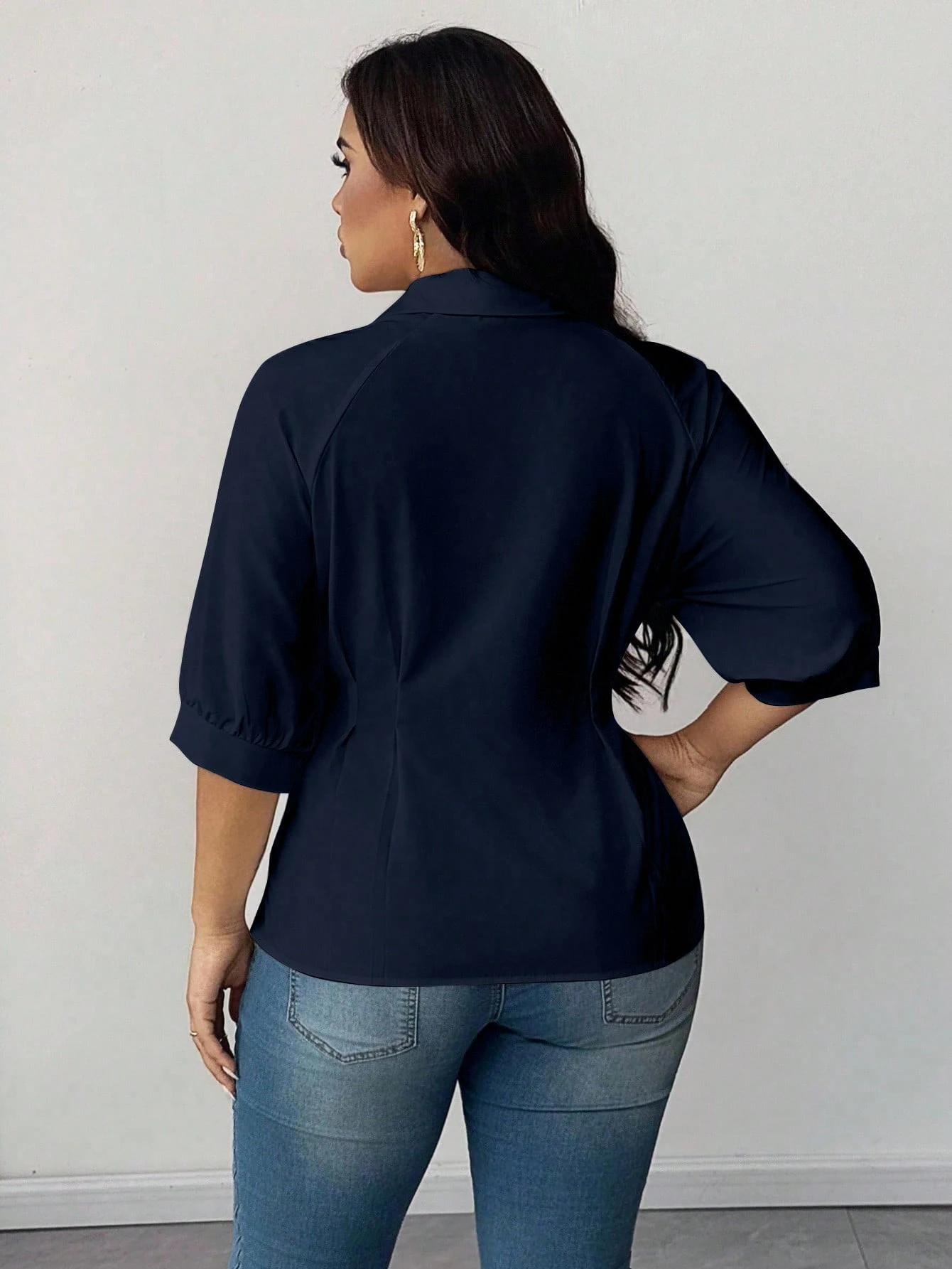 Blusa elegante de talla grande con cuello y cintura fruncida de unicolor