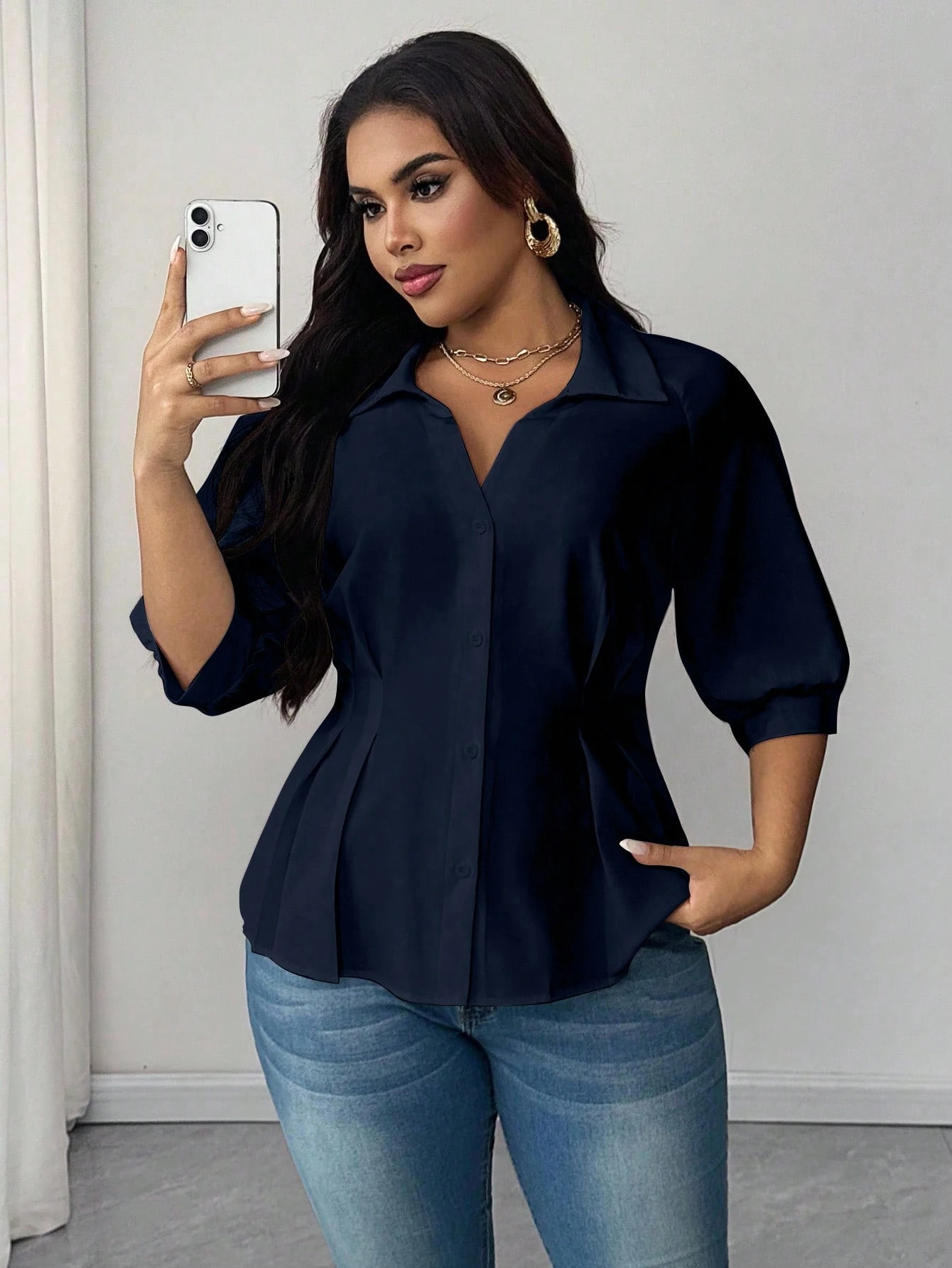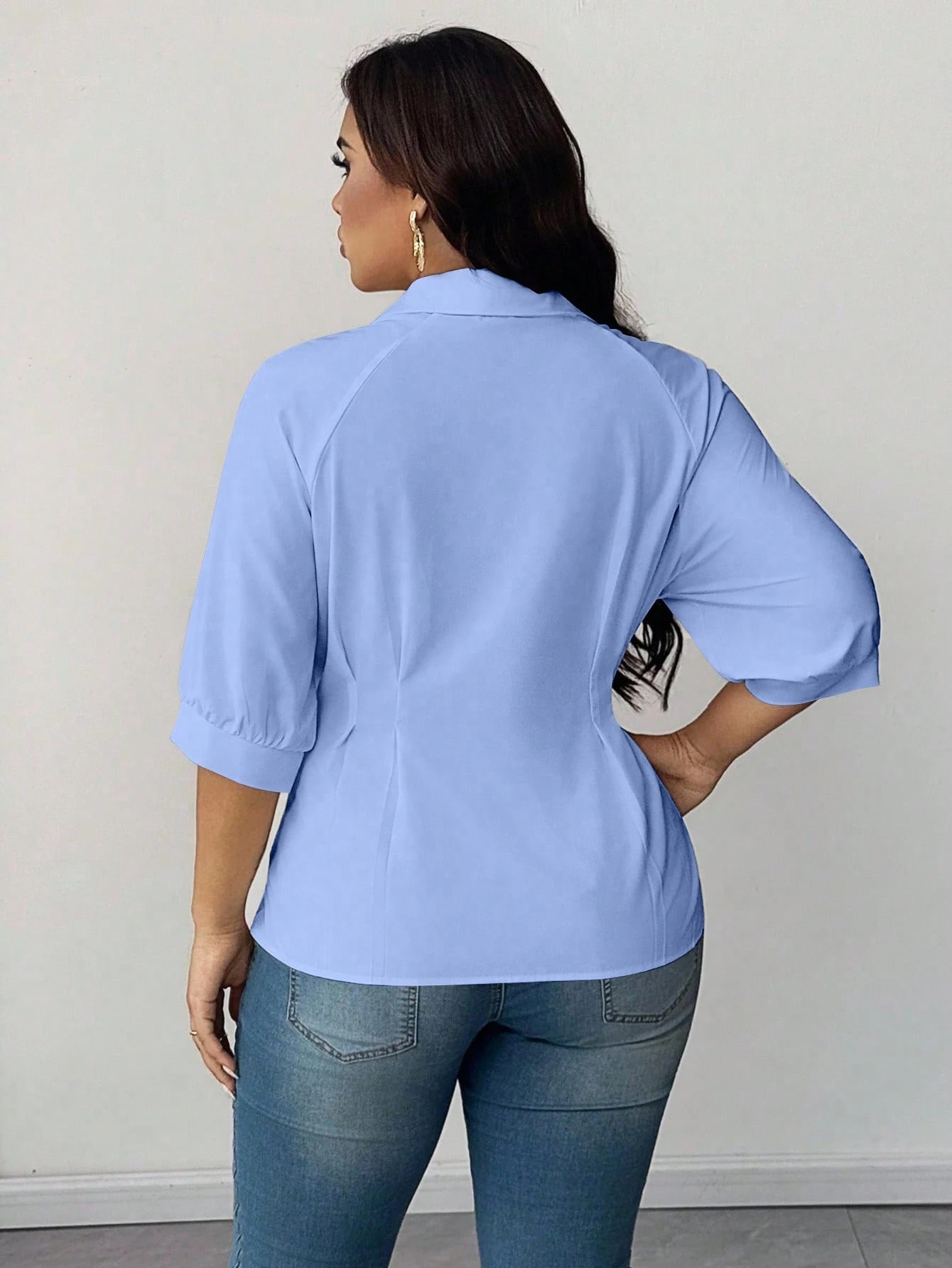 Blusa elegante de talla grande con cuello y cintura fruncida de unicolor