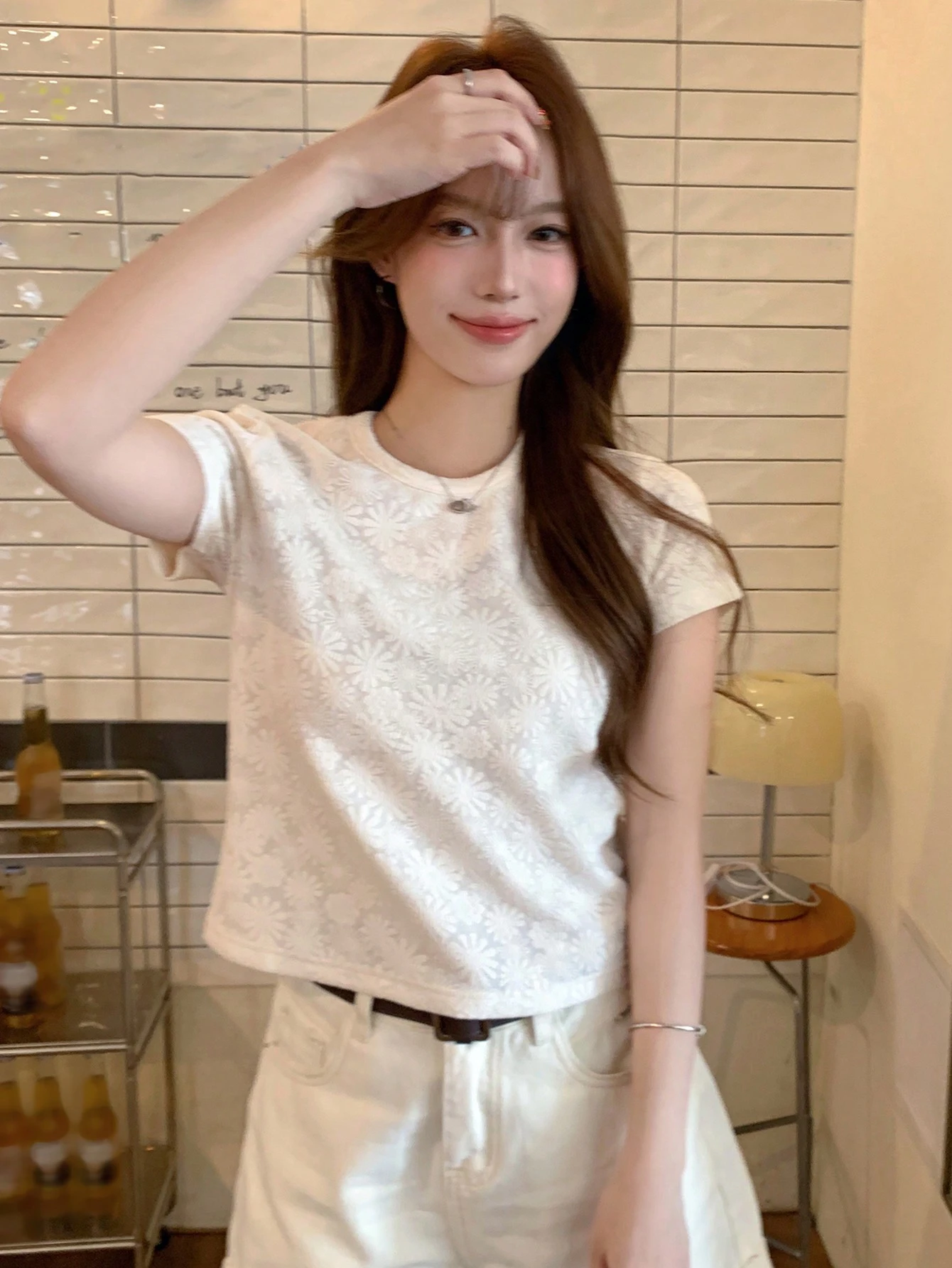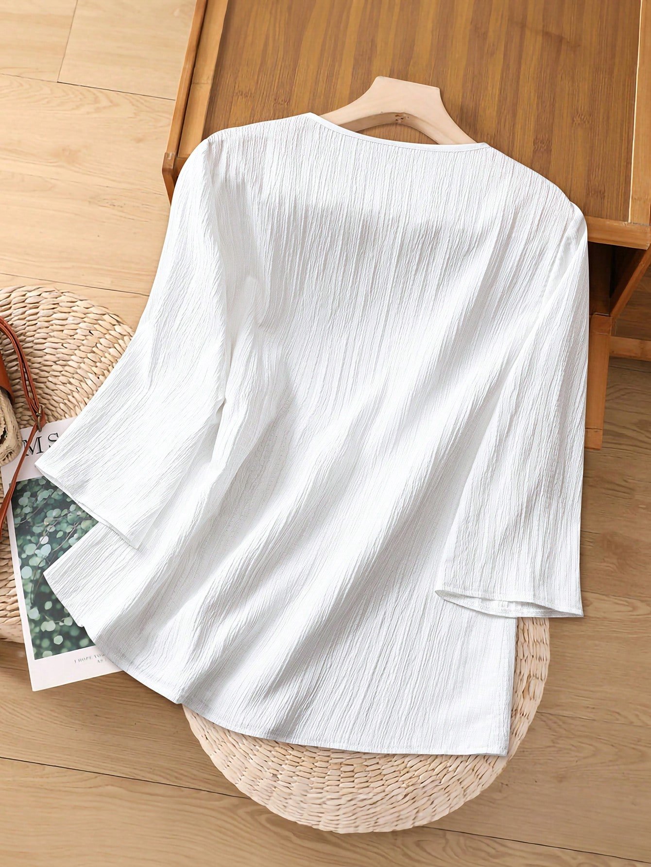 Blusa suelta de moda de 3/4 de manga con encaje de contraste