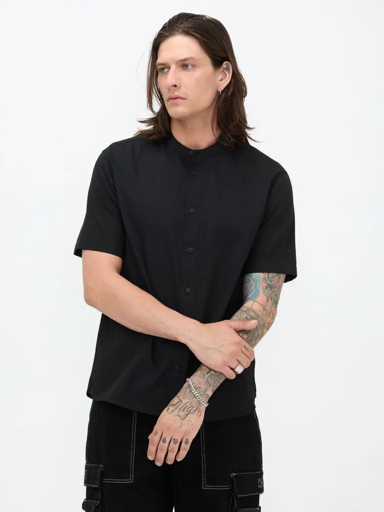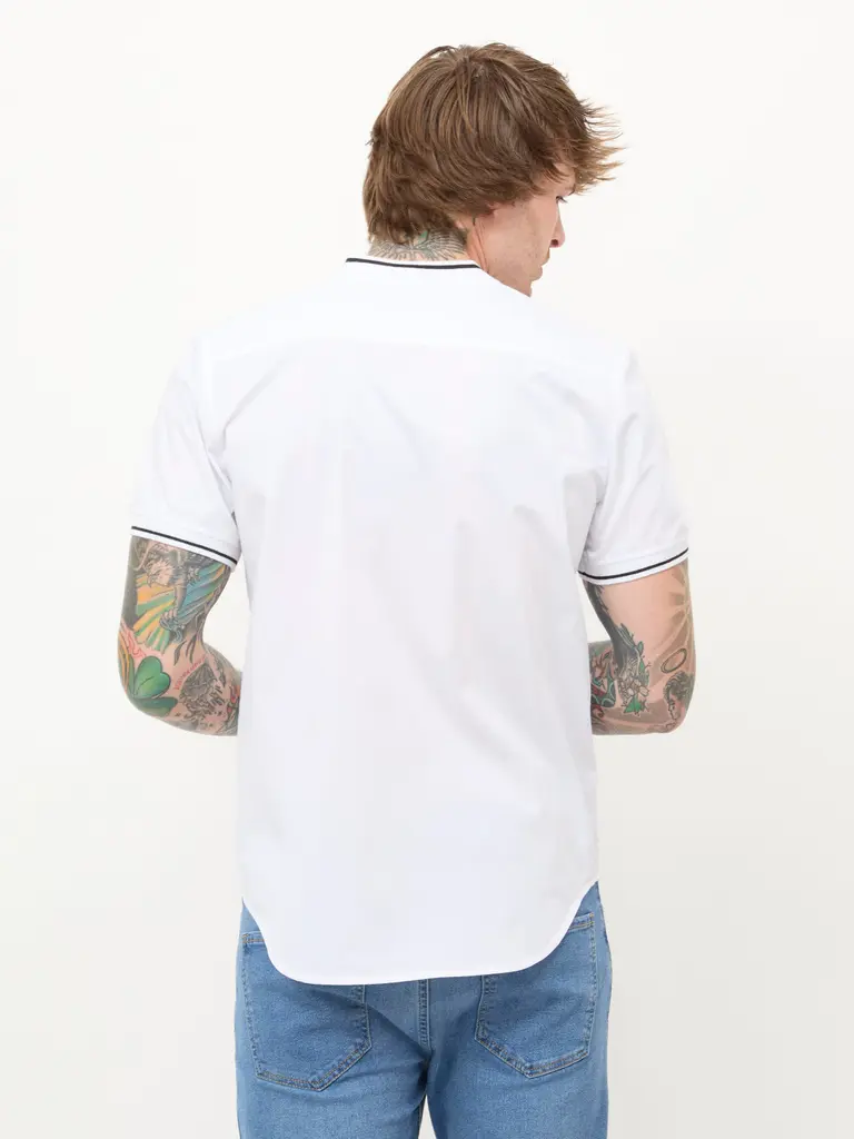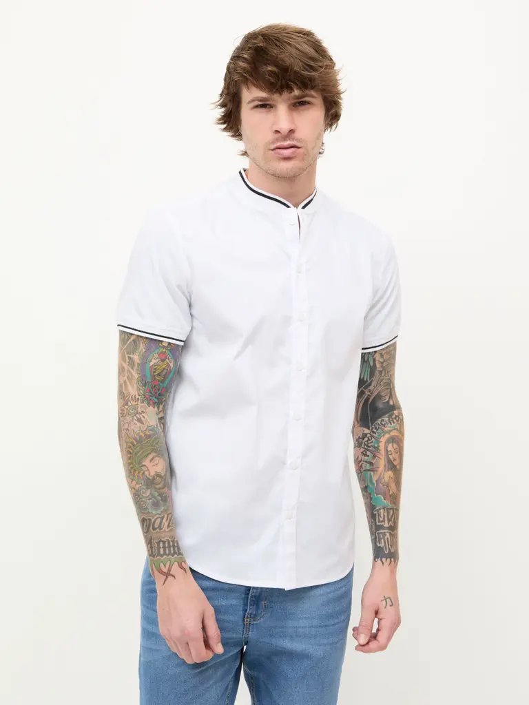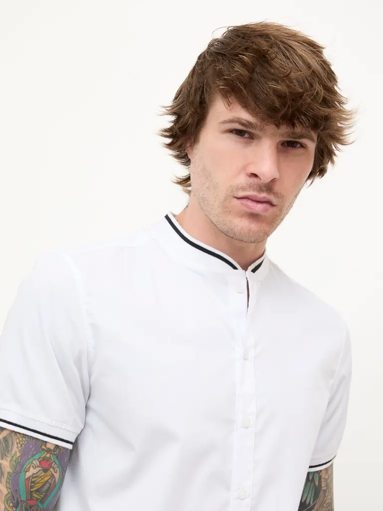 Camisa blanca cuello mao y manga corta con puños en contraste.