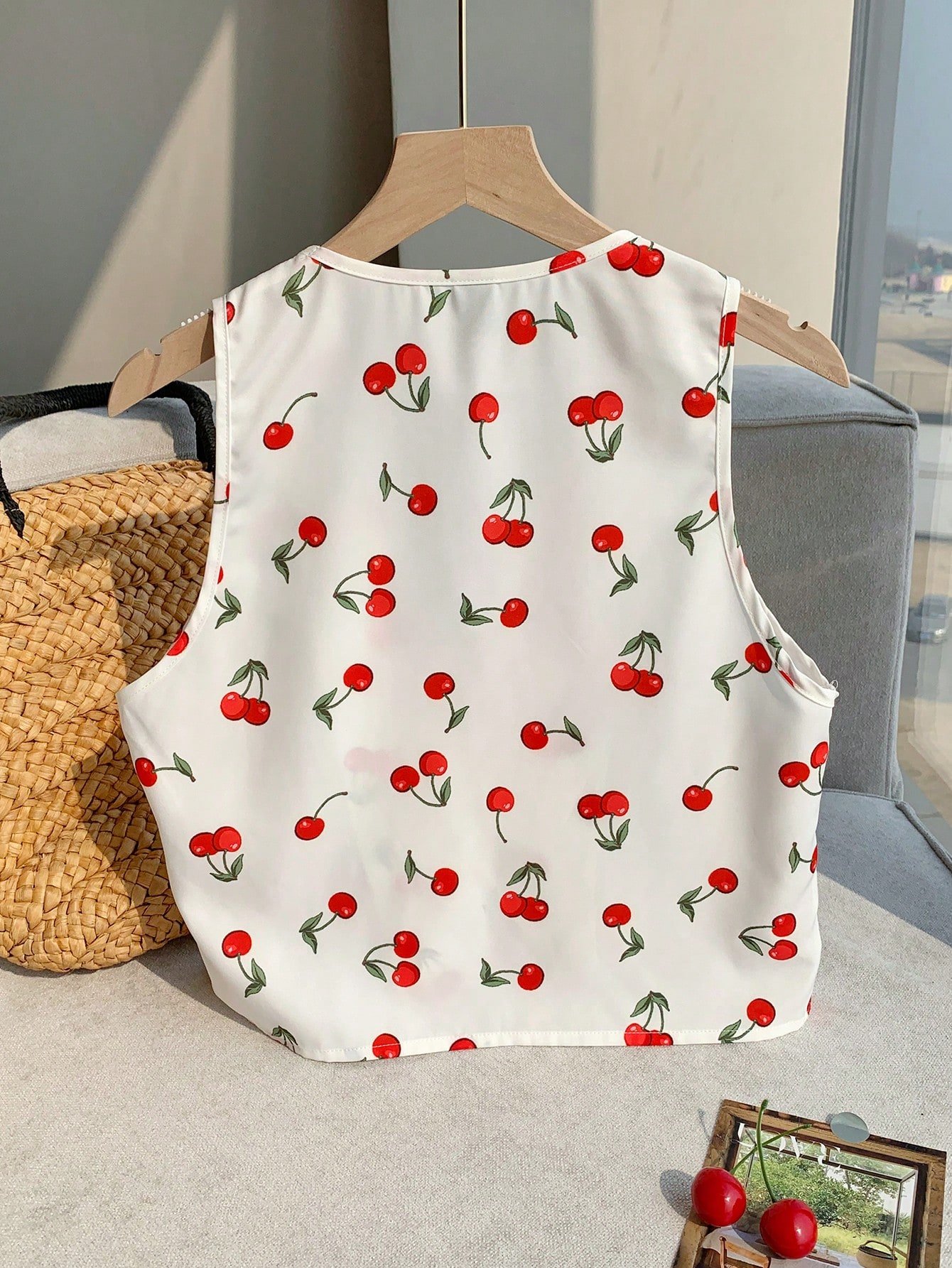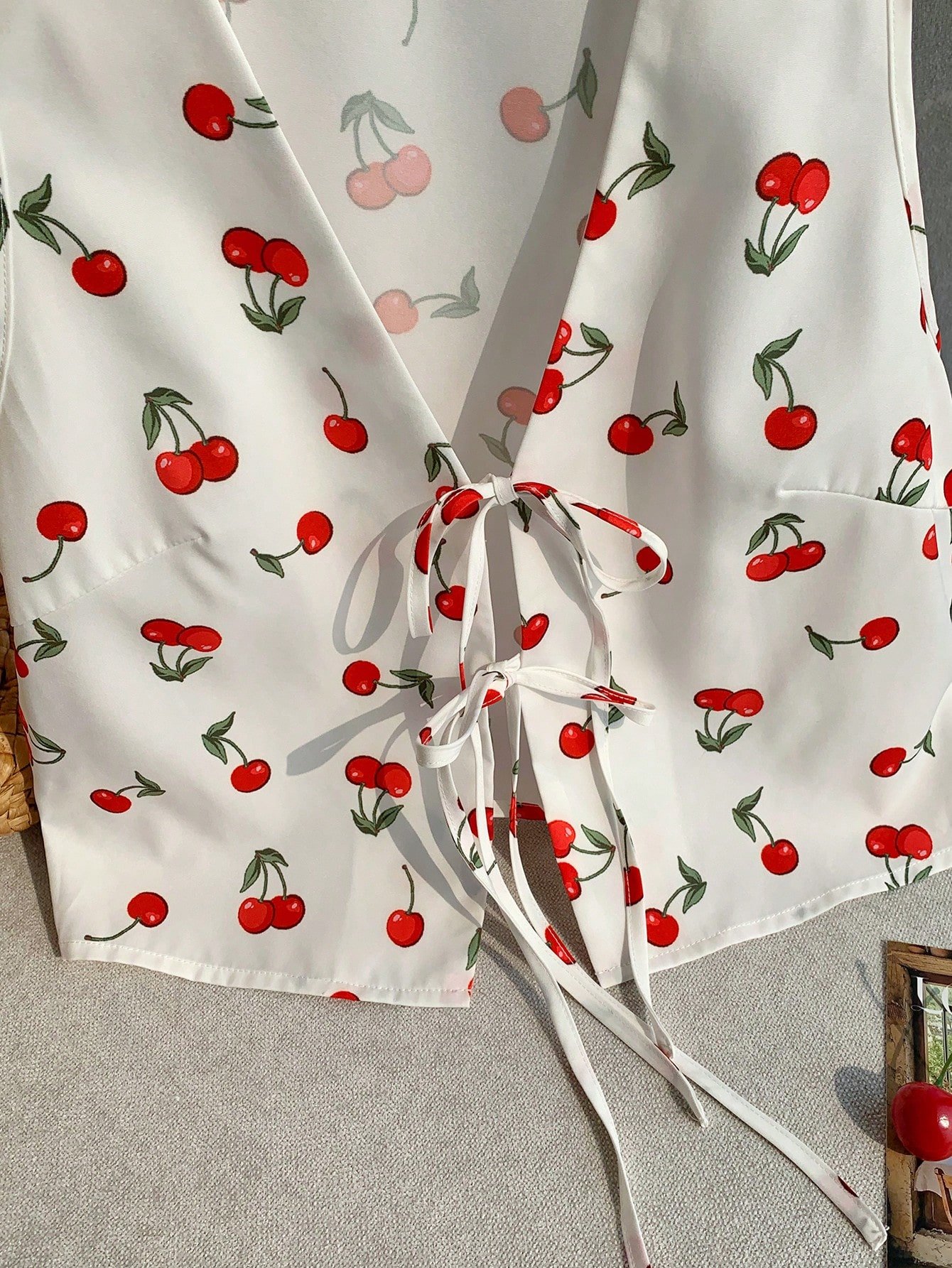 Camisa casual de mujer con nudo delantero y estampado de cerezas