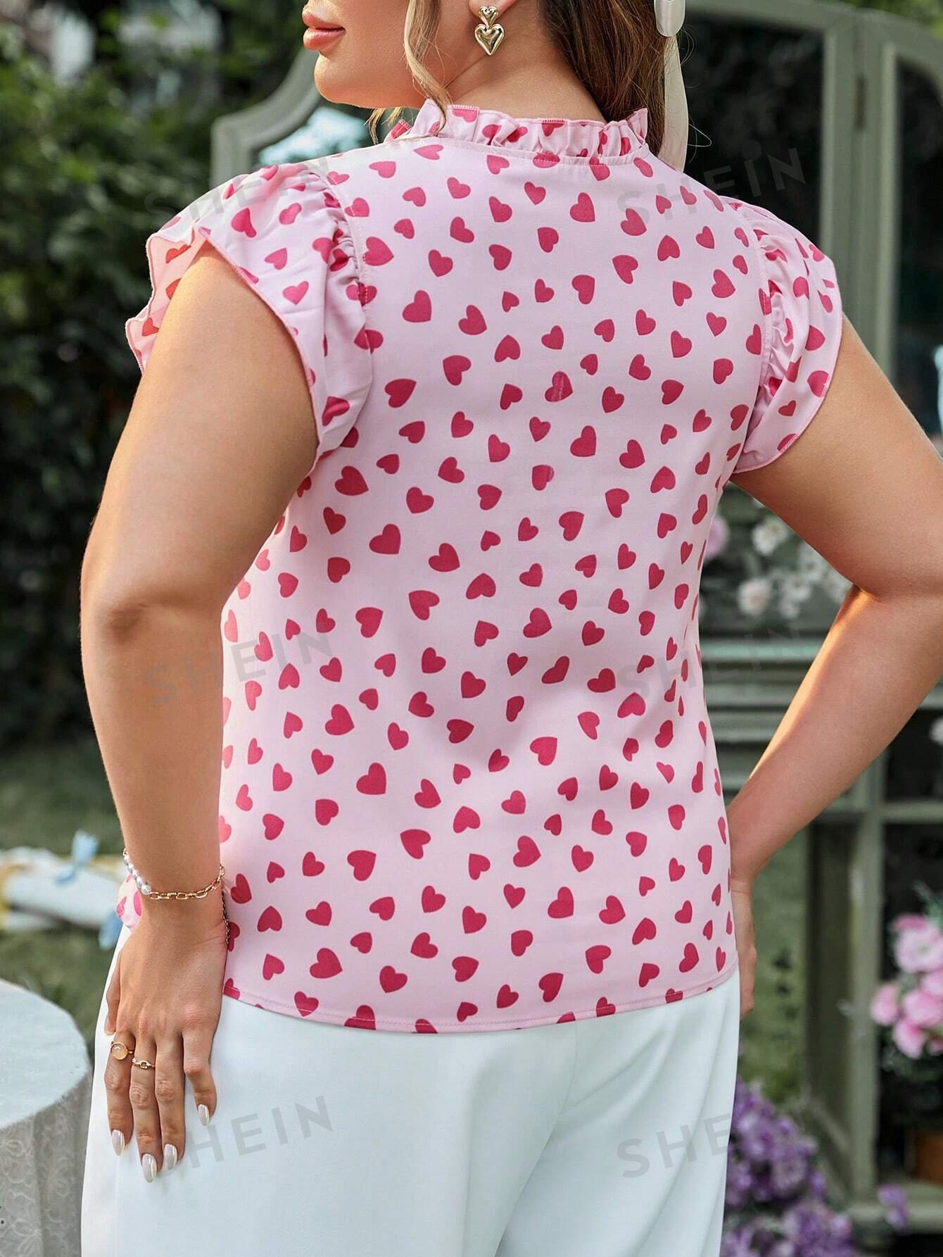 Camisa Con Estampado De Corazones De San Valent?n De Talla Grande, Escote Con Muescas Y Dobladillo Con Volantes