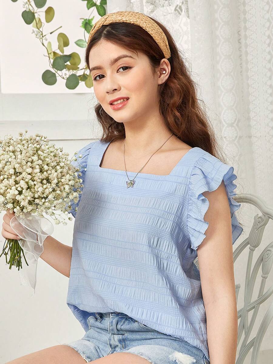 Camisa informal de manga corta con cuello cuadrado y textura tejida