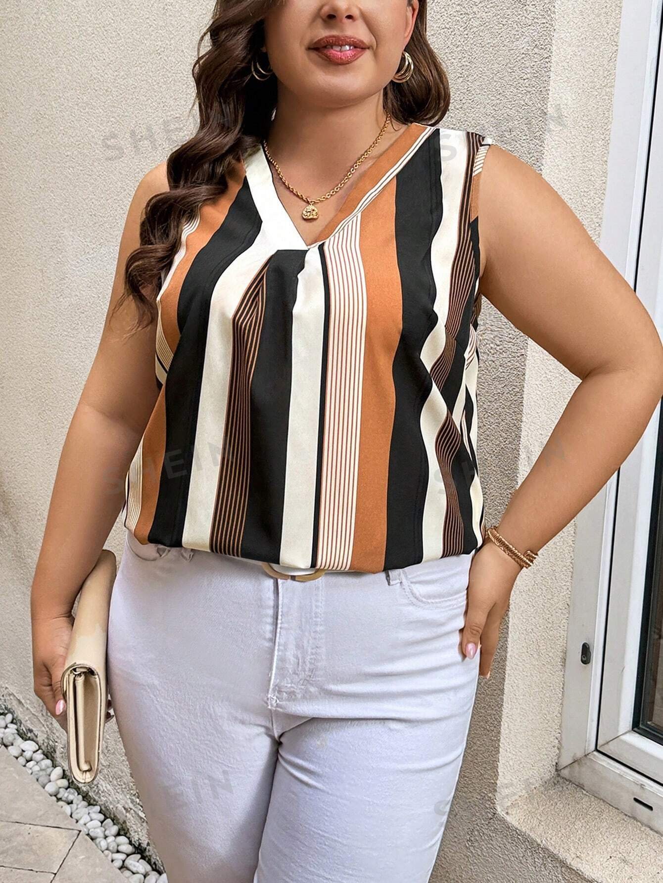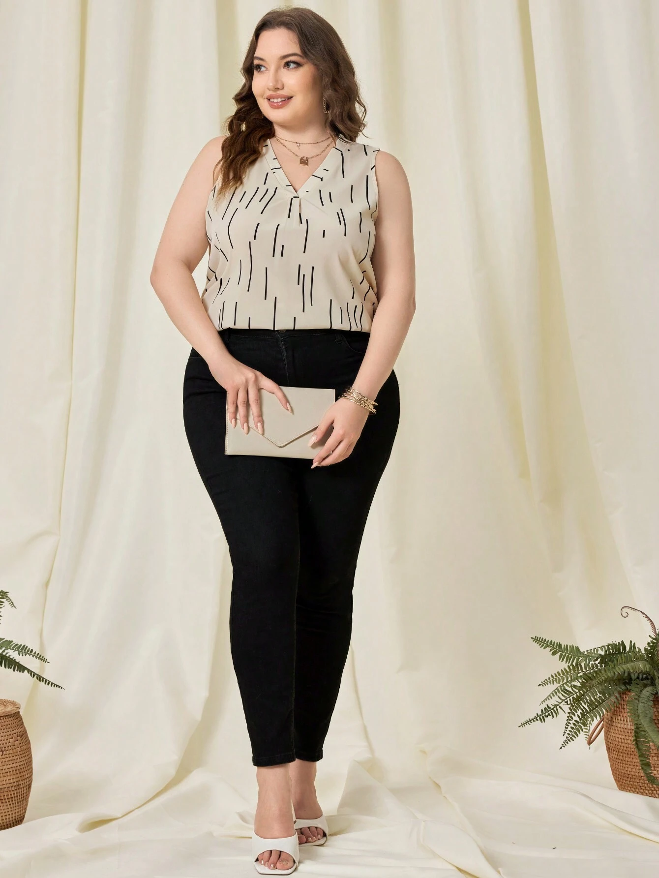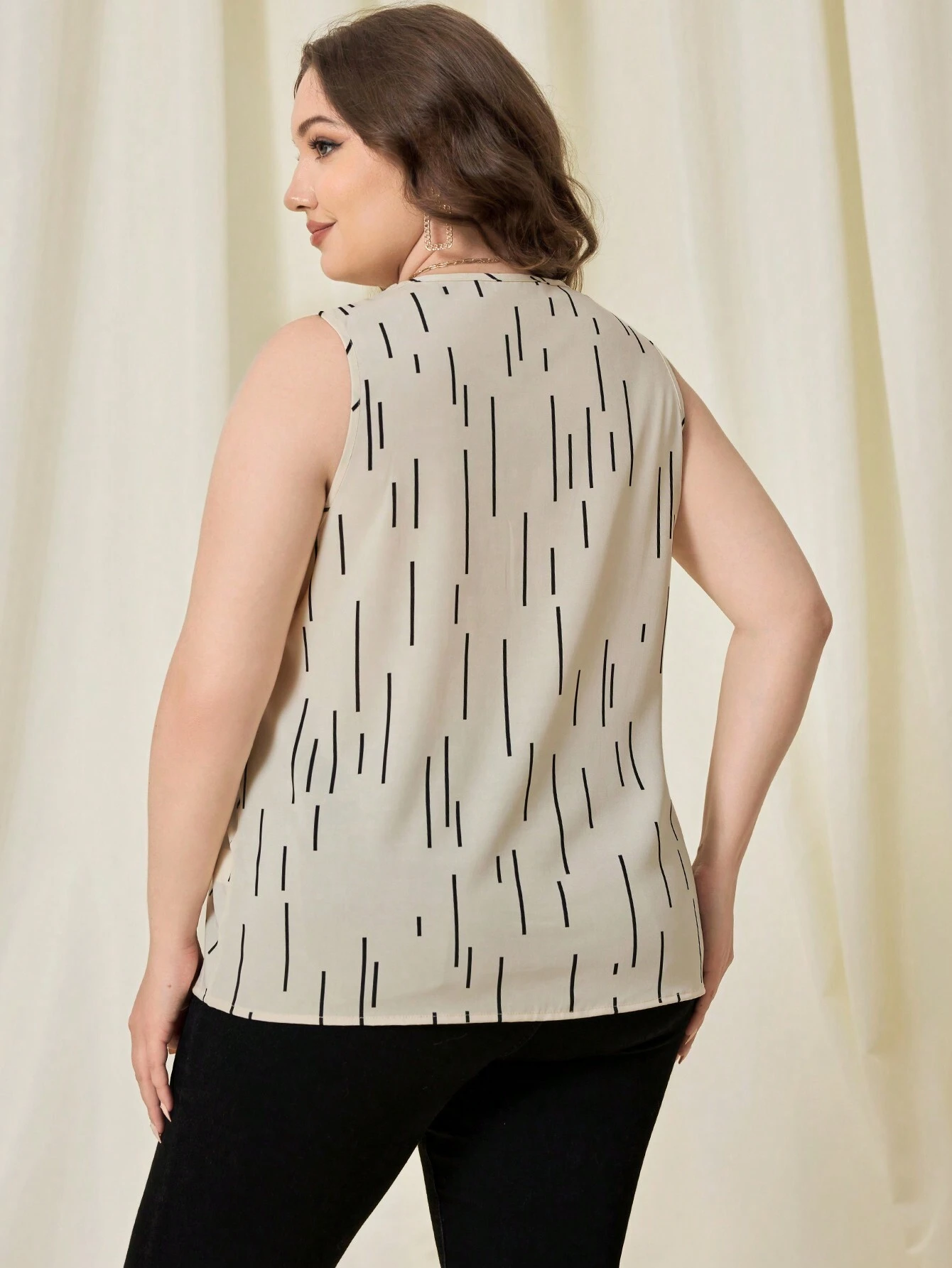 Camisa sin mangas de talla grande con cuello en V y estampado de l?nea