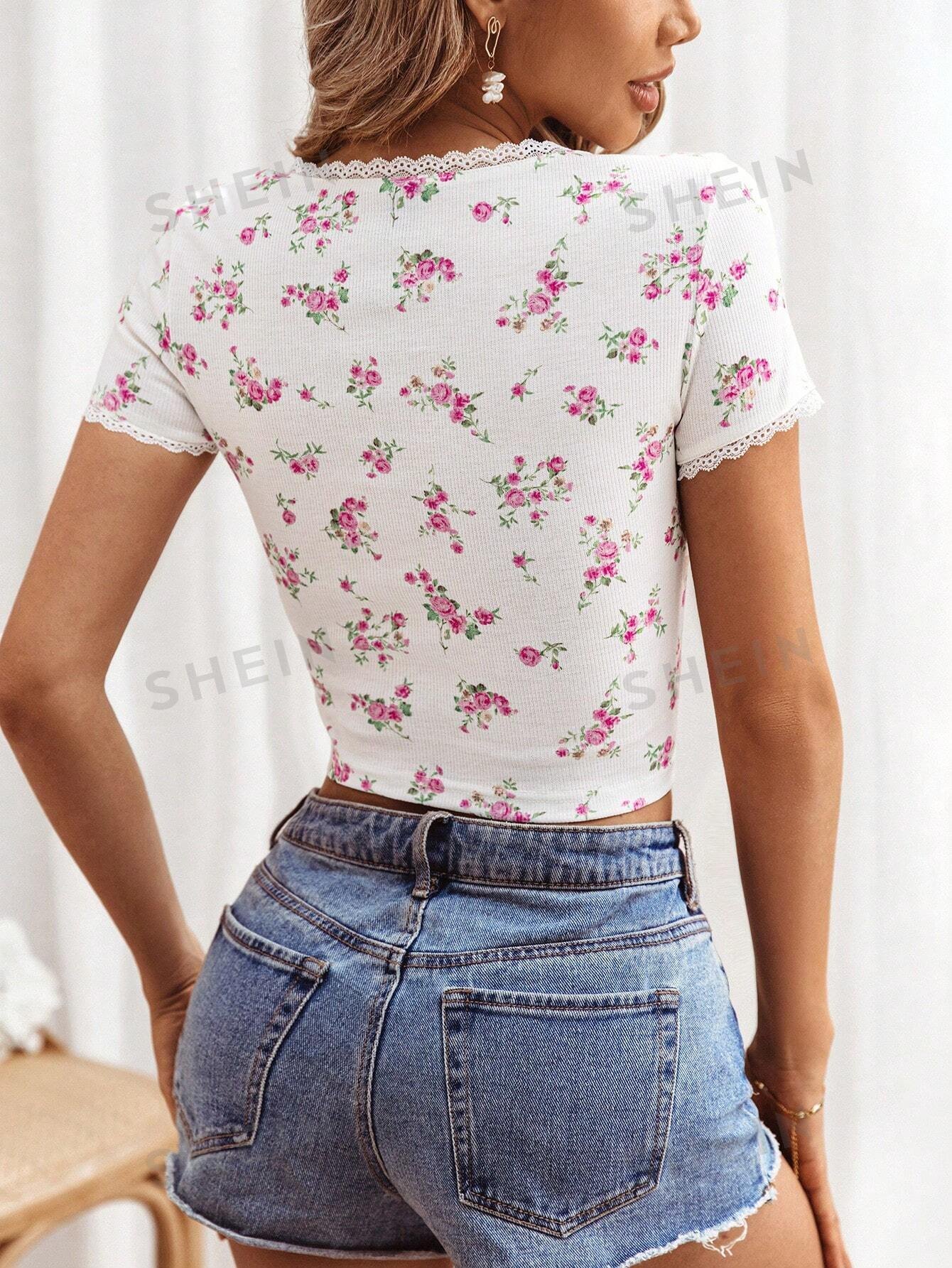 Camiseta ajustada con cuello cuadrado de flores impresas de manga corta