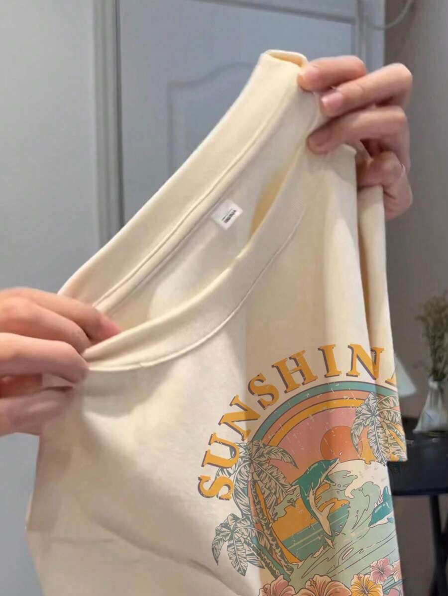 Camiseta ajustada de manga corta y cuello redondo con estampado de paisaje simple