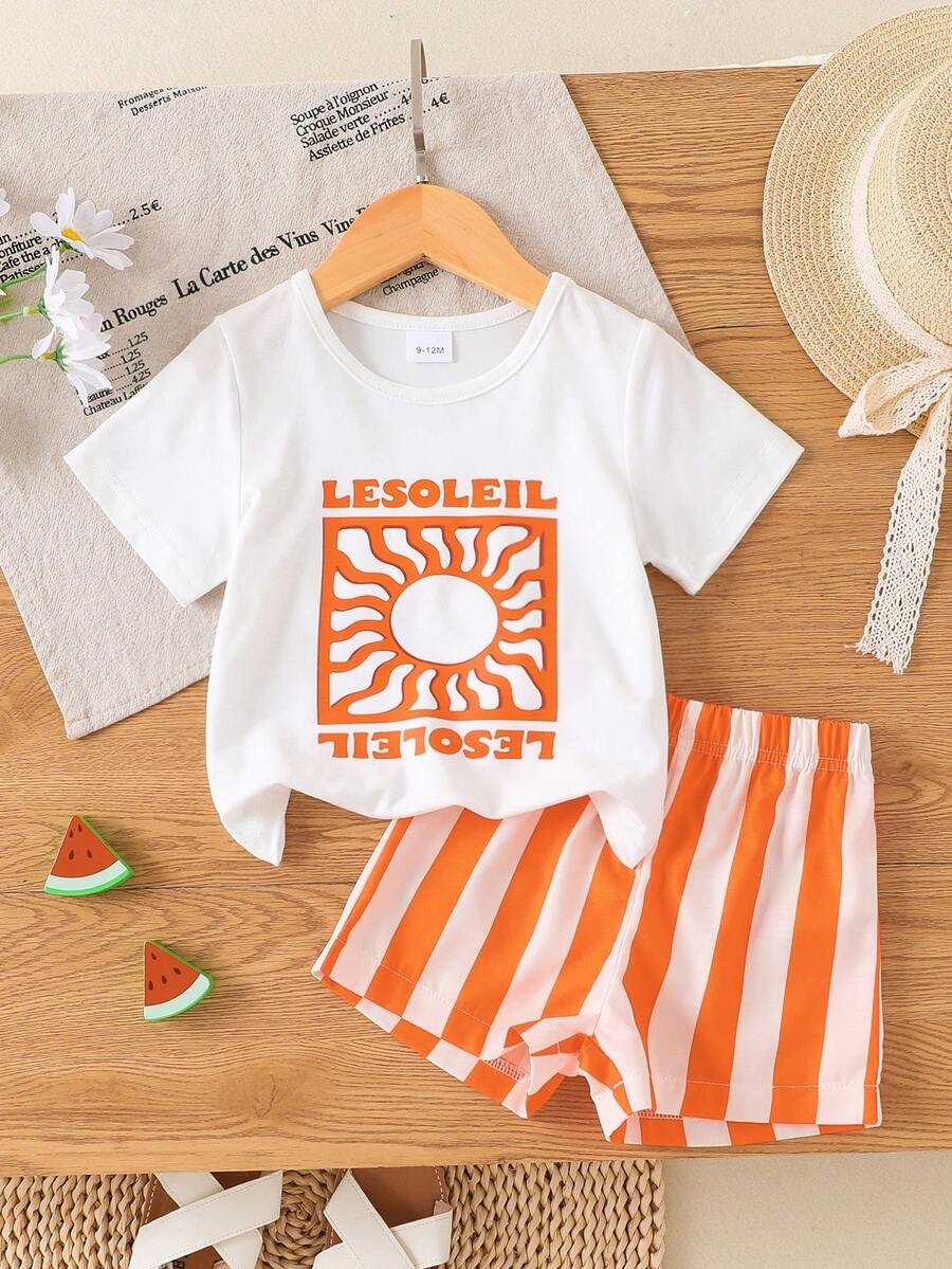 Camiseta con cuello redondo, estampado y pantalones cortos a rayas