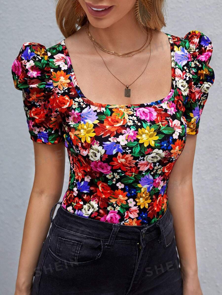 Camiseta con estampado floral de manga farol