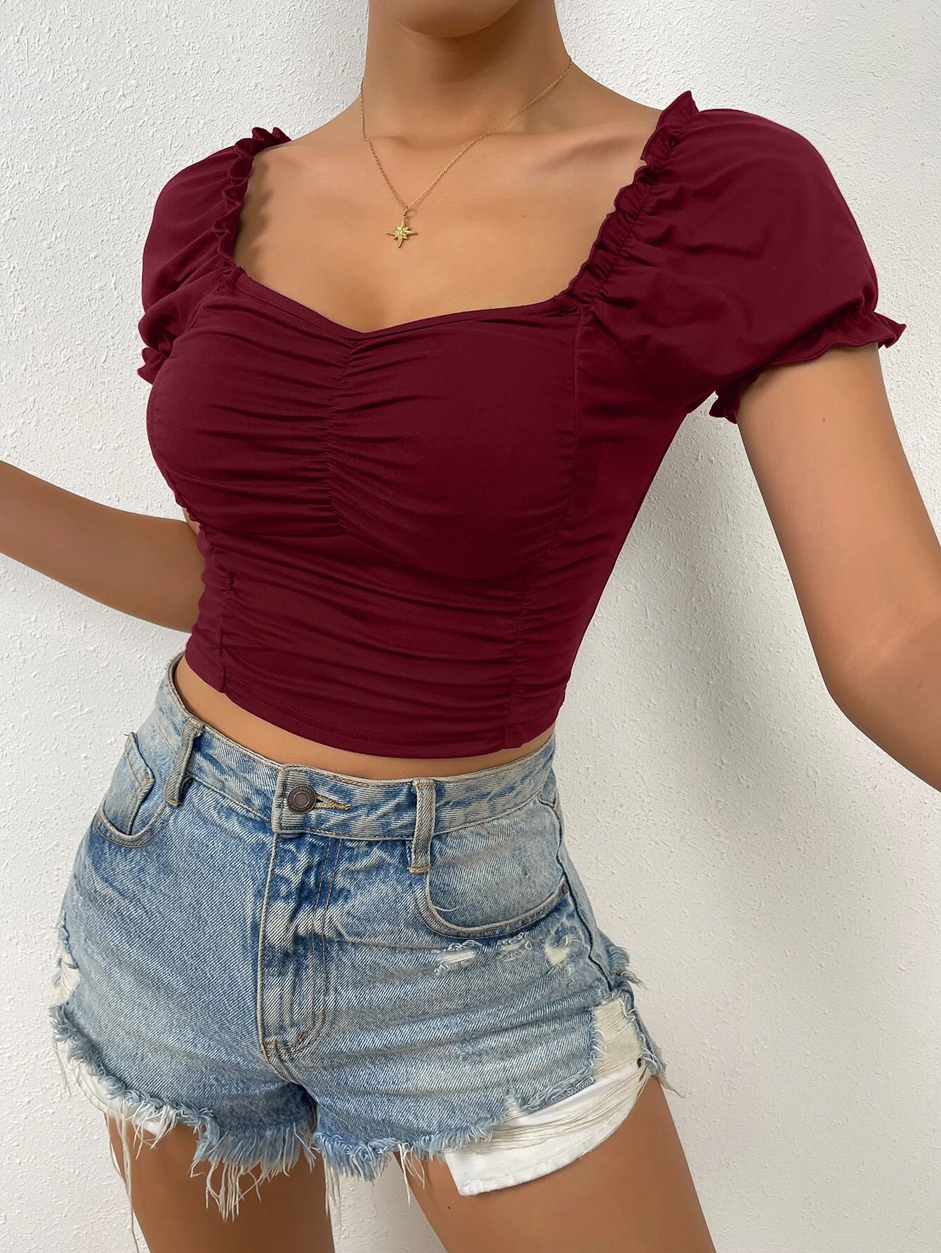 Camiseta corta fruncido delantero escote coraz?n de manga farol