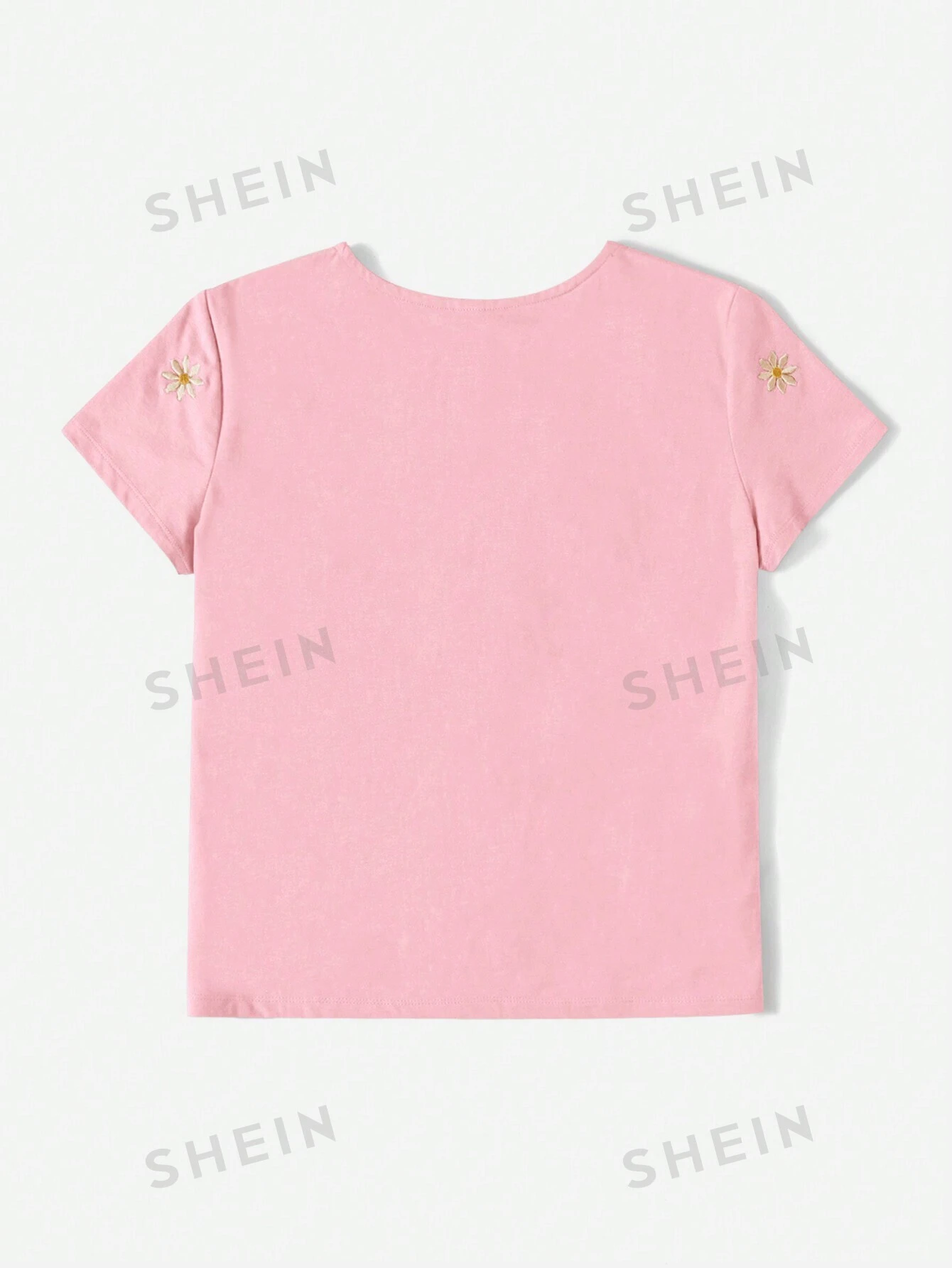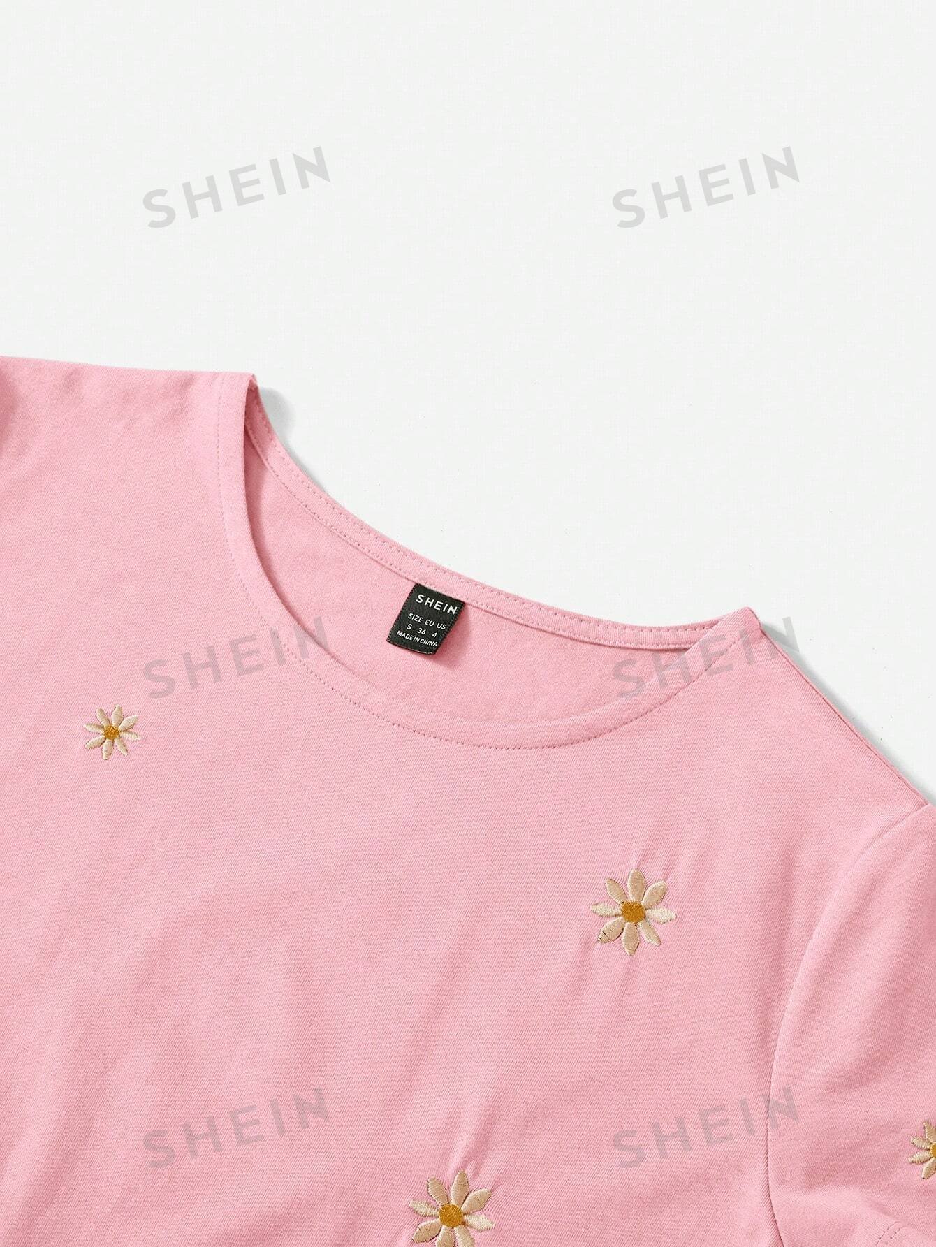 Camiseta De Manga Corta Con Cuello Redondo Y Bordado De Flores