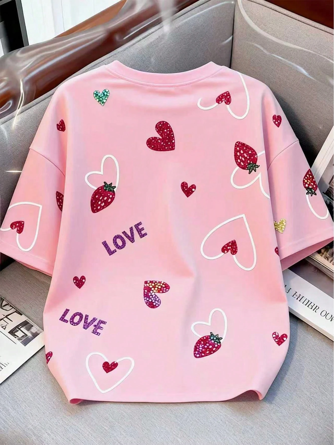 Camiseta de manga corta con cuello redondo y estampado de corazón y fresa para mujer