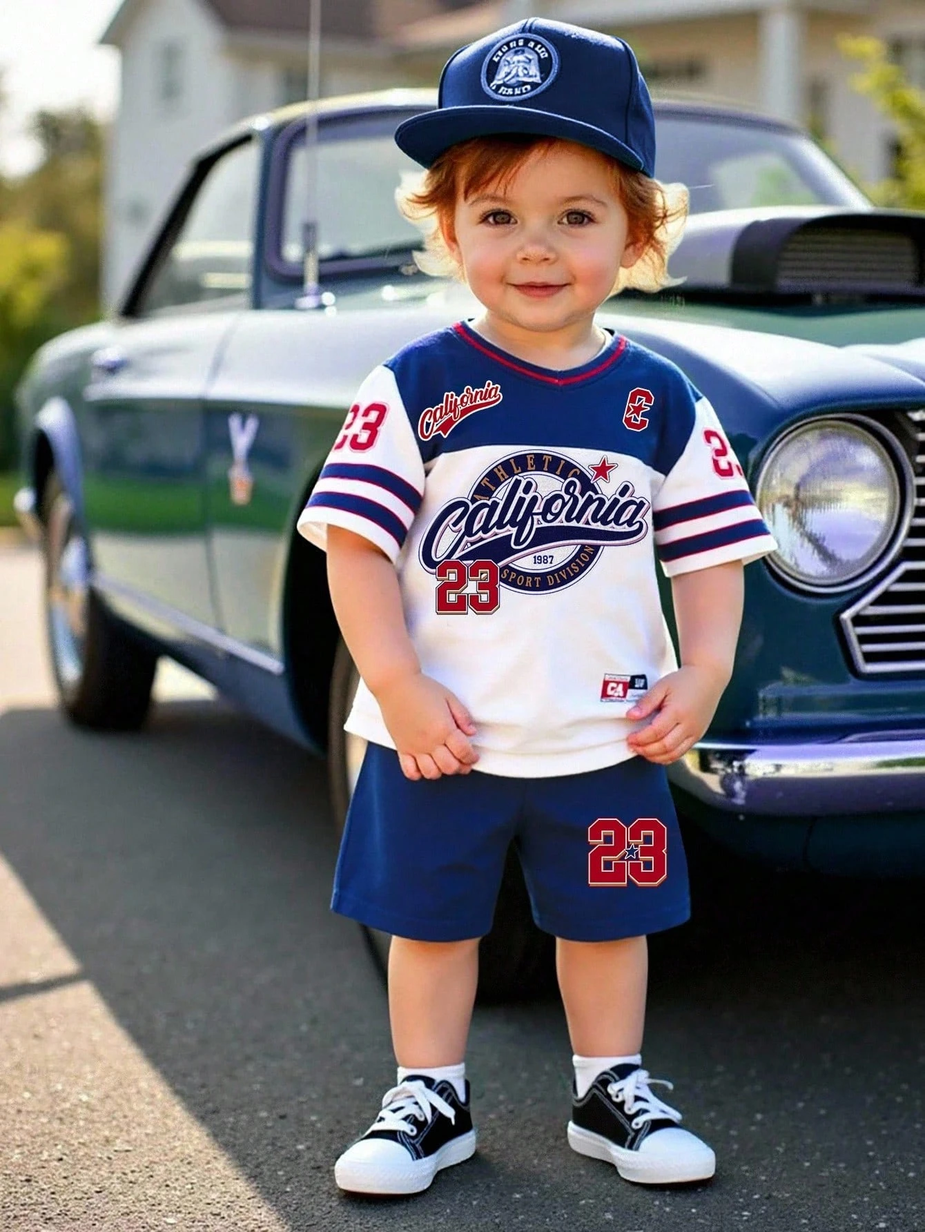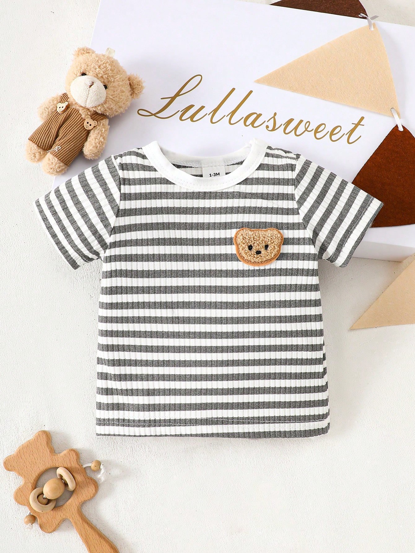 Camiseta de manga corta con estampado de oso y rayas + pantalones cortos azul marino