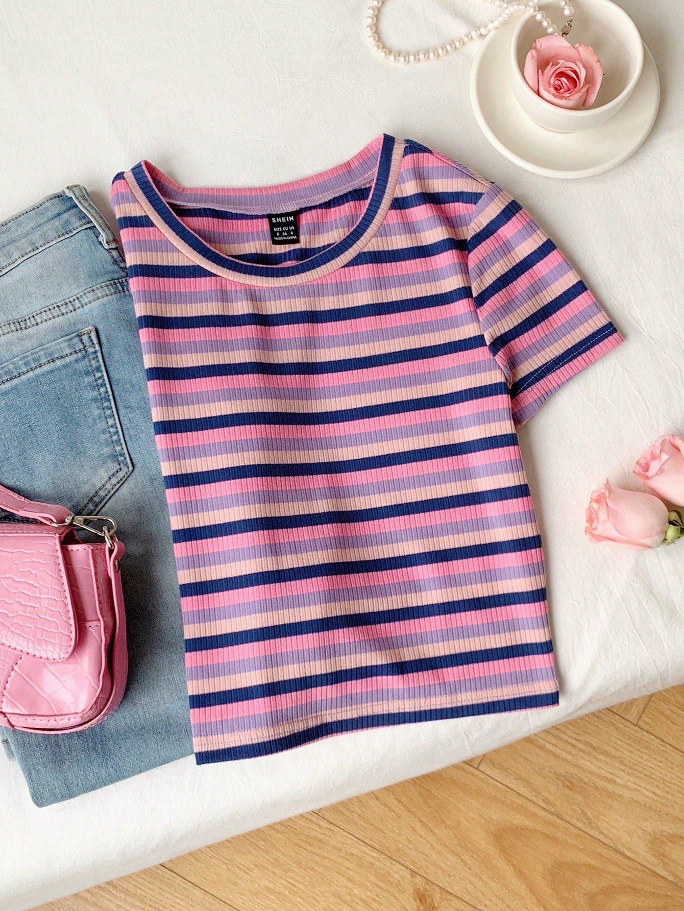 Camiseta de manga corta de punto a rayas con cuello redondo