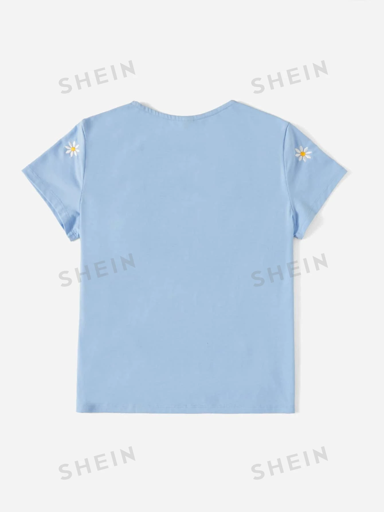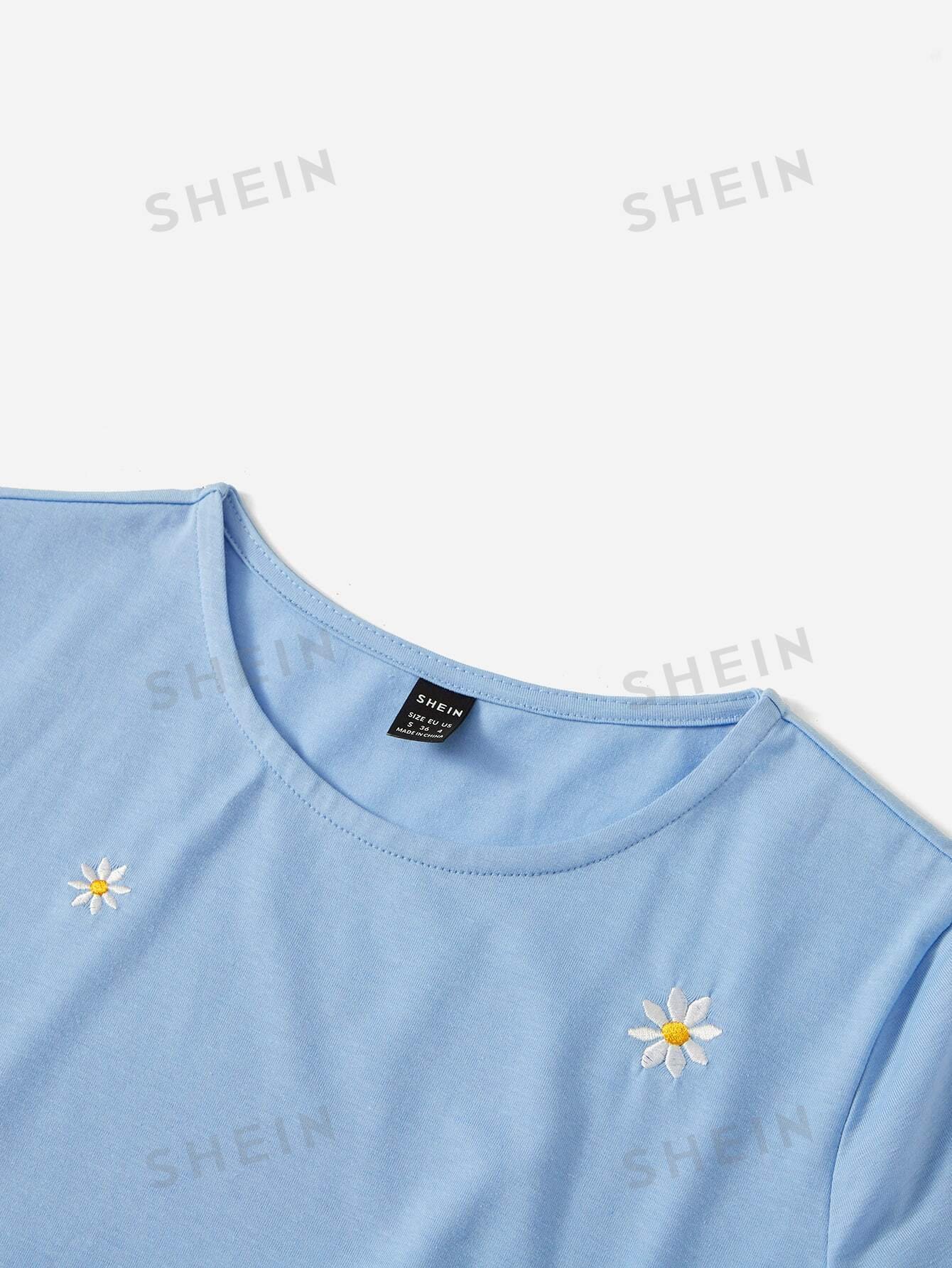 Camiseta De Manga Corta Floral Bordado Casual Y Suelta